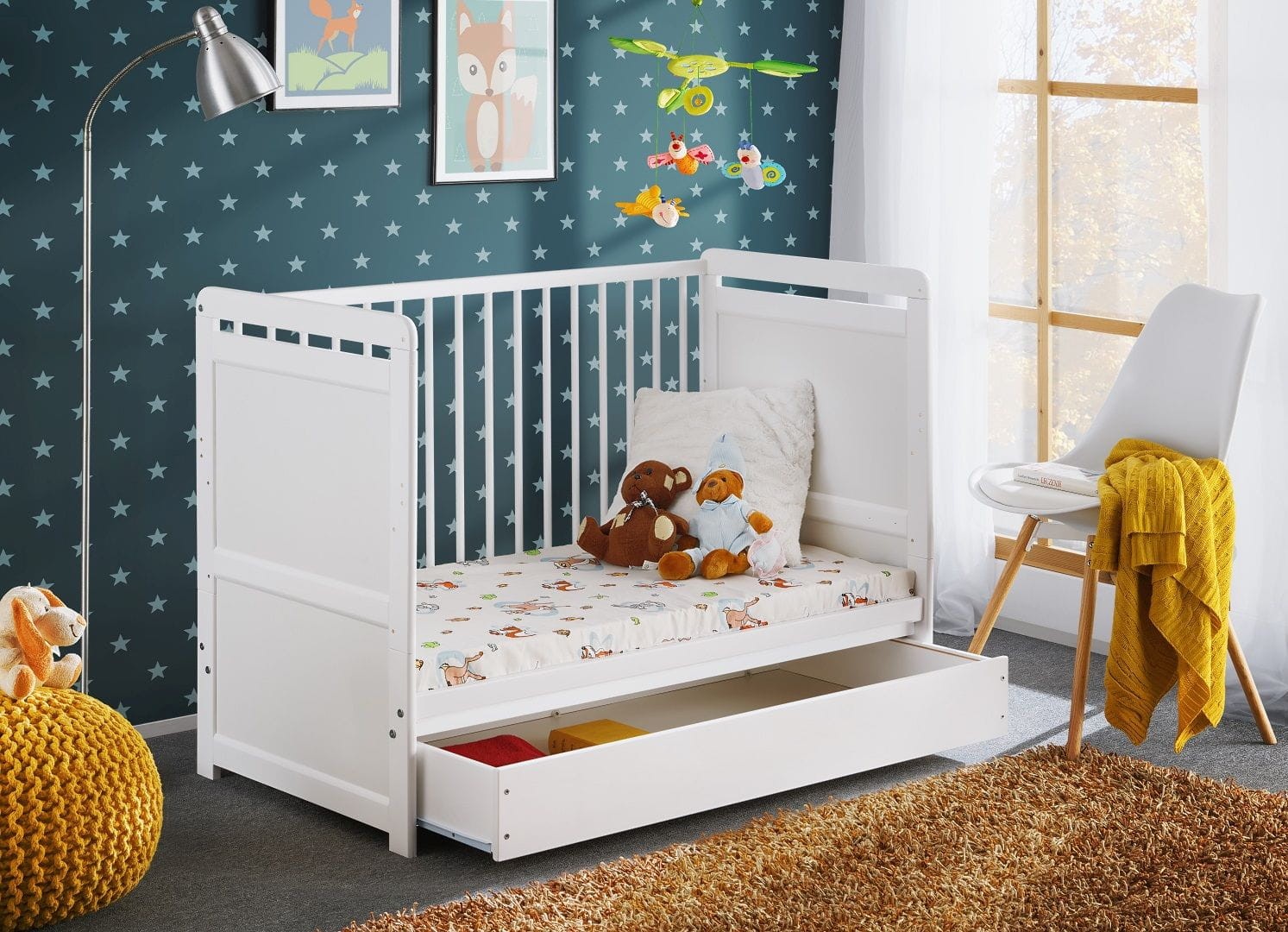 Łóżeczko Tymek Plus wykonane z trwałego drewna sosnowego, jest idealnym rozwiązaniem dla rodziców szukających mebla, który będzie rósł razem z ich dzieckiem. Charakteryzuje się nie tylko klasycznym wyglądem, ale także wysoką funkcjonalnością. Pod łóżkiem znajduje się szuflada, zapewniająca dodatkową przestrzeń do przechowywania, co jest niezwykle praktyczne w utrzymaniu porządku w pokoju dziecka. Łóżeczko oferuje regulację wysokości szczeblinek oraz możliwość demontażu trzech z nich, co ułatwia dostosowanie do potrzeb i bezpieczeństwa malucha. Dzięki trzem poziomom regulacji wysokości dna, mebel może być łatwo dostosowany do rosnącego dziecka, zapewniając mu komfort i bezpieczeństwo. Dodatkowo, łóżeczko posiada opcję zmiany w tapczanik, co znacząco przedłuża jego użyteczność, czyniąc go doskonałym wyborem na lata.