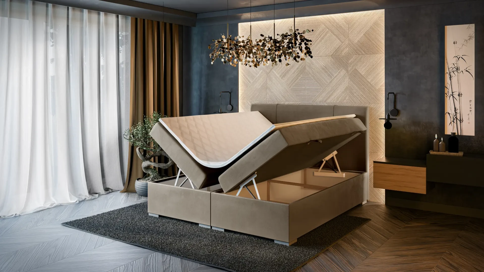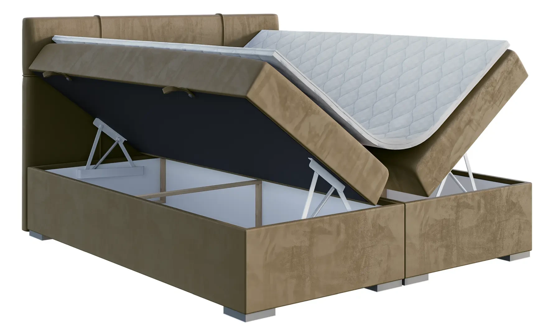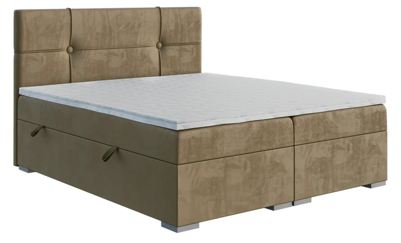 Niezależne materace ze sprężynami typu bonell oraz pianką T-25 jak i wierzchni topper z pianki T-21 zapewniają idealne dopasowanie do kształtu ciała. Dostęp do pojemnych schowków na pościel ułatwiają bezpieczne automaty. Duża wysokość powierzchni spania zmniejsza wysiłek wstawania z łóżka (co jest doskonałą informacja dla osób starszych) oraz sprawia, że w strefie snu znajduje się znacznie mniej roztoczy i zanieczyszczeń, niż w przypadku łóżek niższych. Nie licząc wezgłowia cała powierzchnia łóżka to materac dzięki czemu łóżko zachowuje kompaktowe rozmiary ułatwiając jego wpasowanie nawet w ciaśniejsze sypialnie mieszkań miejskiej dżungli.