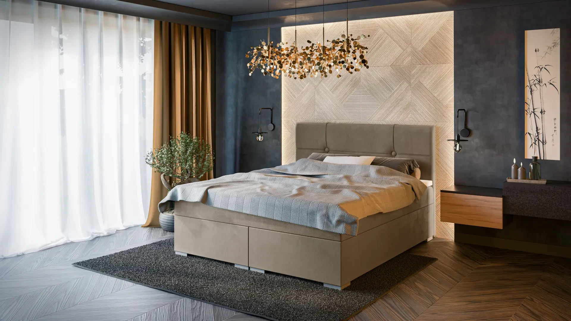 Łóżka kontynentalne z serii Gaia z opcją pojemnika występują w aż 7 wariantach szerokości oraz wielu tkaninach do wyboru. Wariant o szerokości 200 cm, za sprawą swoich wymiarów, idealnie sprawdzi się jako łóżko sypialniane dla dwóch osób dorosłych. Dzięki zastosowaniu pojedynczego materaca w węższych wersjach i oddzielnych materacy w szerszych stanowi wygodne posłanie i niezależny komfort spania. Klasyczne, przeszywane wezgłowie z guzikami jest eleganckie i miłe w dotyku dzięki zastosowaniu 3 cm pianki pod tkaniną - nasi Klienci zgłaszają że potrafi nawet nieco wyciszyć odgłosy chrapania ich partnerów ;) Łóżko kontynentalne to wybór dla osób poszukujących eleganckich i masywnych mebli, ceniących komfort i lubiących spać na wyższej niż przeciętne łóżko wysokości.
