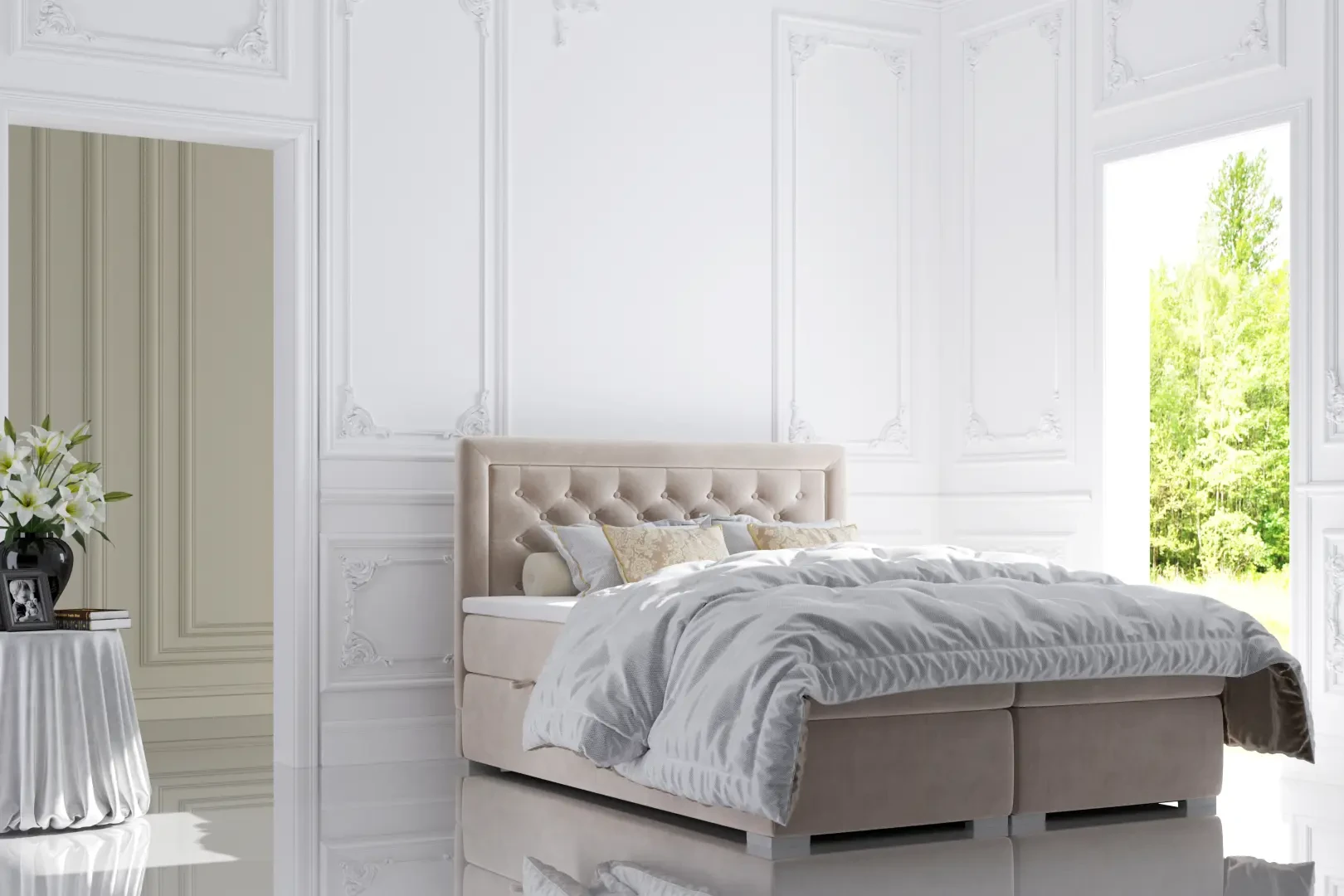 Łóżka kontynentalne z serii Glamour z opcją pojemnika występują w aż 7 wariantach szerokości oraz wielu tkaninach do wyboru. Wariant o szerokości 120 cm dzięki swoim wymiarom idealnie sprawdzi się jako łóżko sypialniane dla dwóch osób dorosłych. Dzięki zastosowaniu pojedynczego materaca w węższych wersjach i oddzielnych materacy w szerszych stanowi wygodne posłanie i niezależny komfort spania. Klasyczne, pikowane guzikami wezgłowie jest eleganckie i miłe w dotyku dzięki zastosowaniu 3 cm pianki pod tkaniną - nasi Klienci zgłaszają że potrafi nawet nieco wyciszyć odgłosy chrapania ich partnerów ;) Łóżko kontynentalne to wybór dla osób poszukujących eleganckich i masywnych mebli, ceniących komfort i lubiących spać na wyższej niż przeciętne łóżko wysokości.