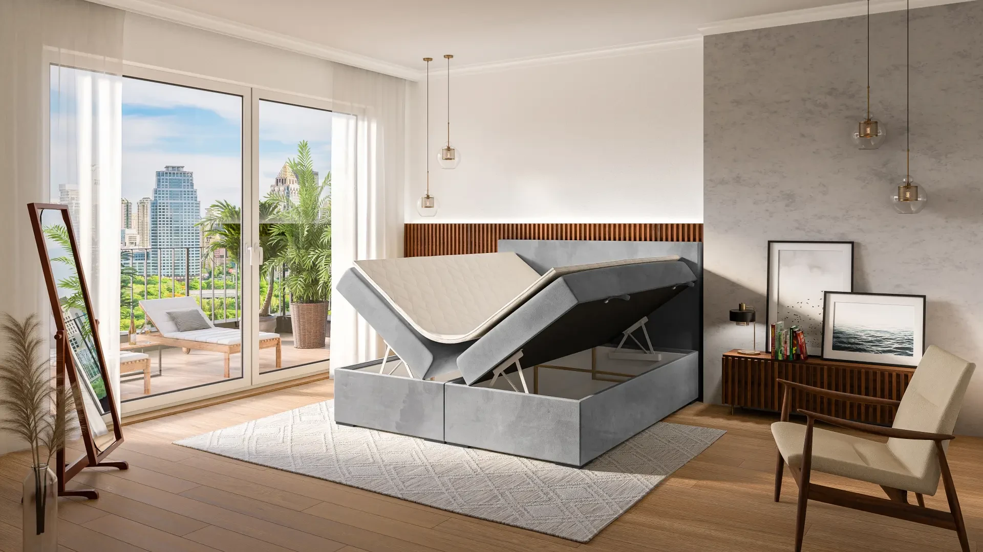Niezależne materace ze sprężynami typu bonell oraz pianką T-25 jak i wierzchni topper z pianki T-21 zapewniają idealne dopasowanie do kształtu ciała. Dostęp do pojemnych schowków na pościel ułatwiają bezpieczne automaty. Duża wysokość powierzchni spania zmniejsza wysiłek wstawania z łóżka (co jest doskonałą informacja dla osób starszych) oraz sprawia, że w strefie snu znajduje się znacznie mniej roztoczy i zanieczyszczeń, niż w przypadku łóżek niższych. Nie licząc wezgłowia cała powierzchnia łóżka to materac dzięki czemu łóżko zachowuje kompaktowe rozmiary ułatwiając jego wpasowanie nawet w ciaśniejsze sypialnie mieszkań miejskiej dżungli.