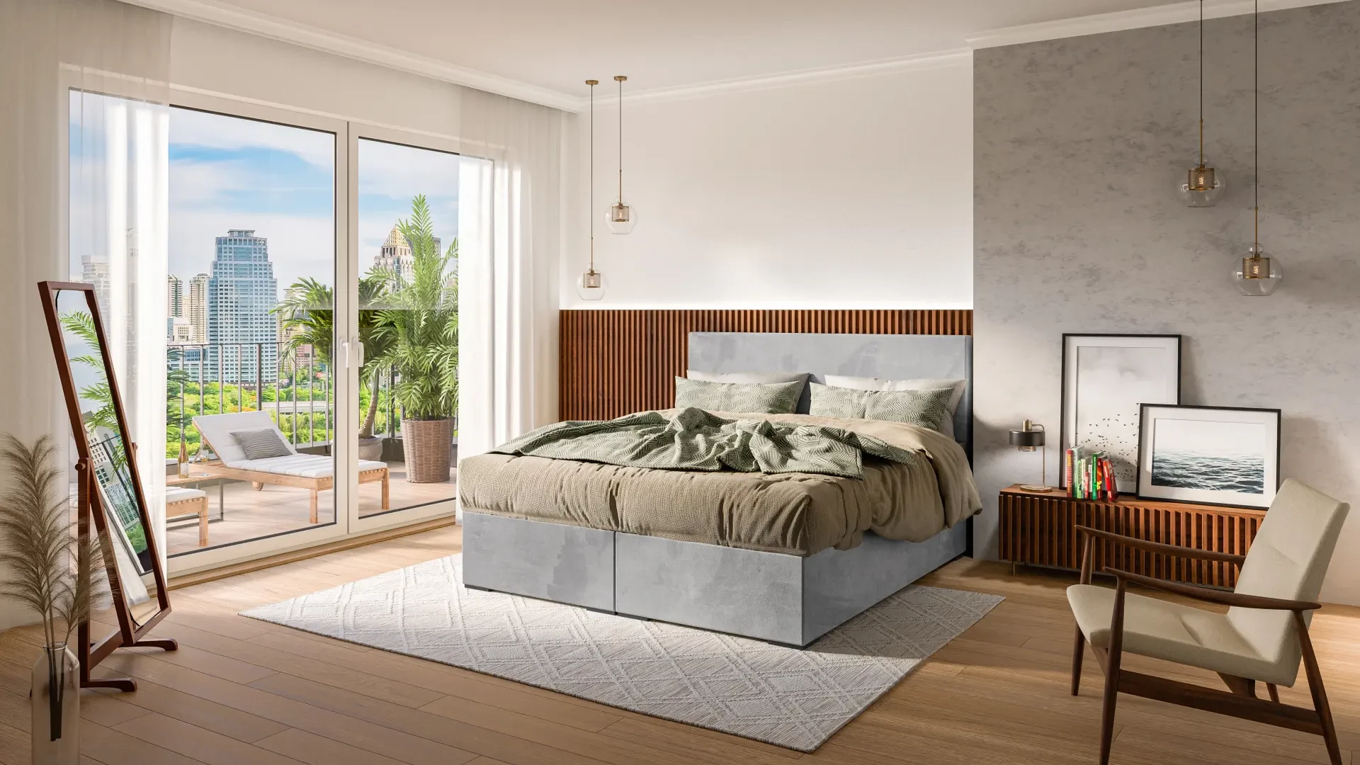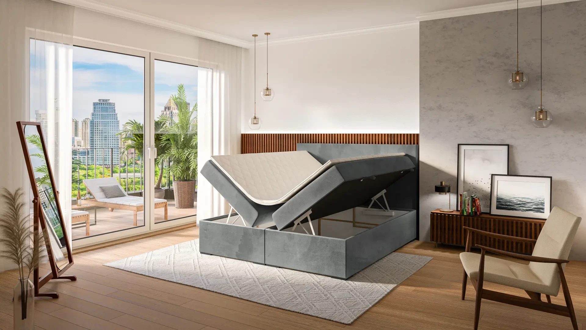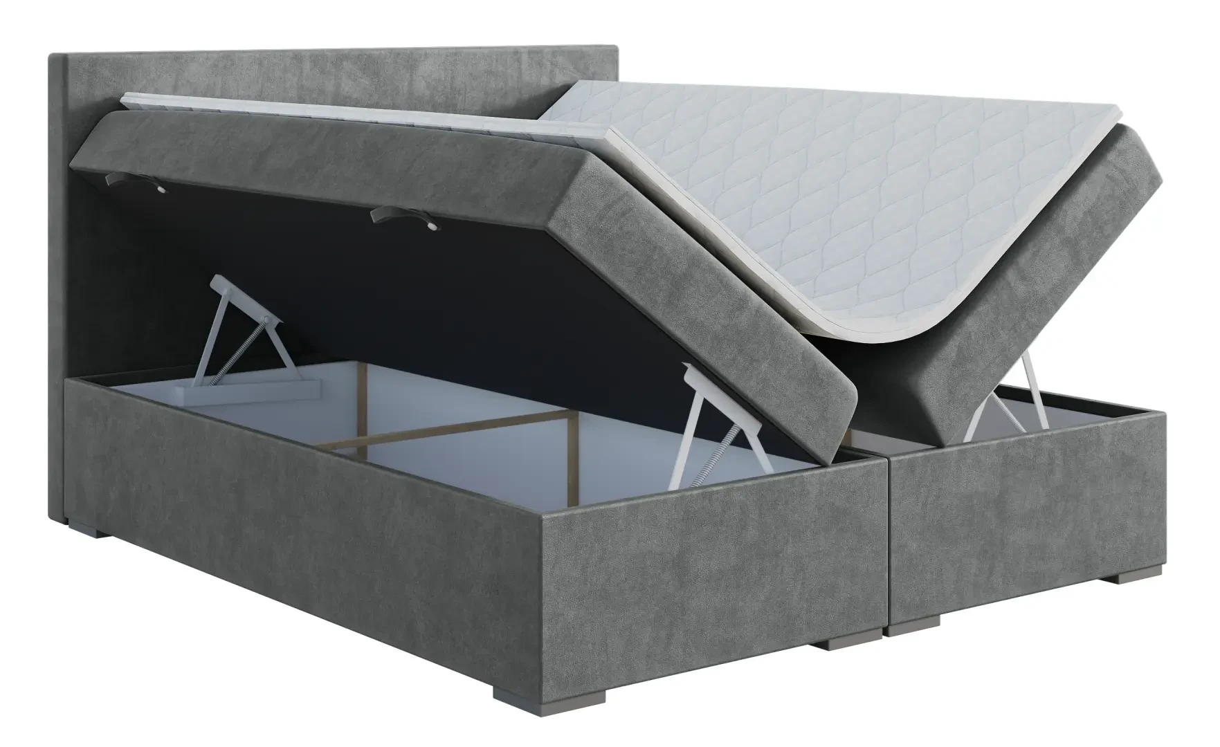Niezależne materace ze sprężynami typu bonell oraz pianką T-25 jak i wierzchni topper z pianki T-21 zapewniają idealne dopasowanie do kształtu ciała. Dostęp do pojemnych schowków na pościel ułatwiają bezpieczne automaty. Duża wysokość powierzchni spania zmniejsza wysiłek wstawania z łóżka (co jest doskonałą informacja dla osób starszych) oraz sprawia, że w strefie snu znajduje się znacznie mniej roztoczy i zanieczyszczeń, niż w przypadku łóżek niższych. Nie licząc wezgłowia cała powierzchnia łóżka to materac dzięki czemu łóżko zachowuje kompaktowe rozmiary ułatwiając jego wpasowanie nawet w ciaśniejsze sypialnie mieszkań miejskiej dżungli.