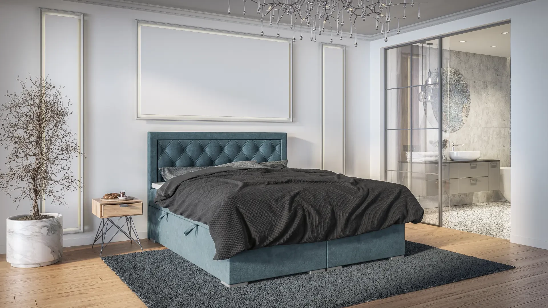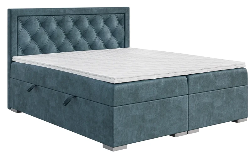 - Wezgłowie przeszywane na kształt rombu oraz pikowane guzikami - miękkie, eleganckie i bezpieczne w użytkowaniu