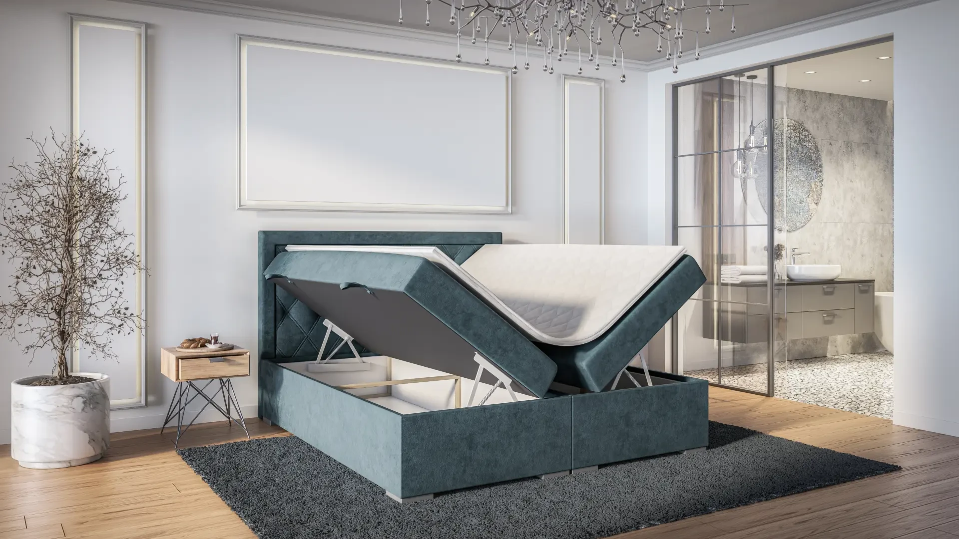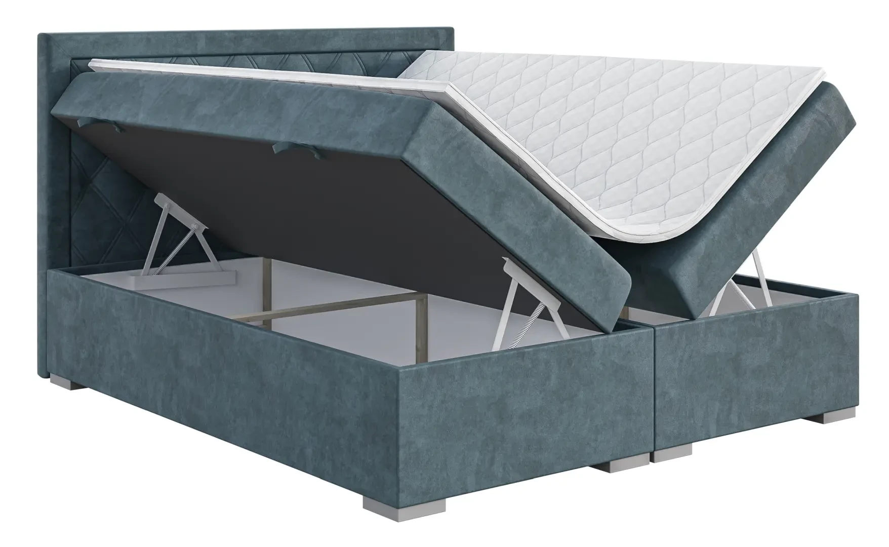 Niezależne materace ze sprężynami typu bonell oraz pianką T-25 jak i wierzchni topper z pianki T-21 zapewniają idealne dopasowanie do kształtu ciała. Dostęp do pojemnych schowków na pościel ułatwiają bezpieczne automaty. Duża wysokość powierzchni spania zmniejsza wysiłek wstawania z łóżka (co jest doskonałą informacja dla osób starszych) oraz sprawia, że w strefie snu znajduje się znacznie mniej roztoczy i zanieczyszczeń, niż w przypadku łóżek niższych. Nie licząc wezgłowia cała powierzchnia łóżka to materac dzięki czemu łóżko zachowuje kompaktowe rozmiary ułatwiając jego wpasowanie nawet w ciaśniejsze sypialnie mieszkań miejskiej dżungli.