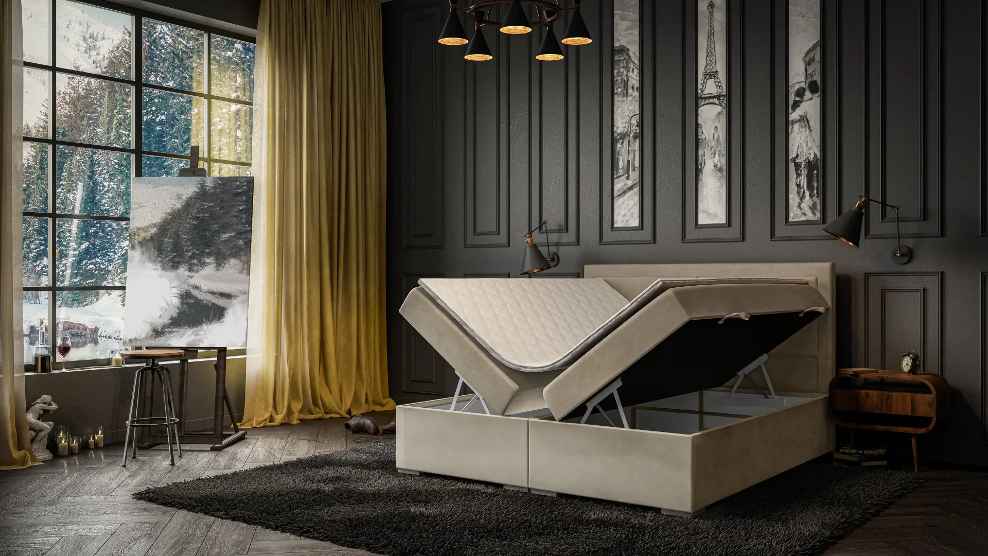 Niezależne materace ze sprężynami typu bonell oraz pianką T-25 jak i wierzchni topper z pianki T-21 zapewniają idealne dopasowanie do kształtu ciała. Dostęp do pojemnych schowków na pościel ułatwiają bezpieczne automaty. Duża wysokość powierzchni spania zmniejsza wysiłek wstawania z łóżka (co jest doskonałą informacja dla osób starszych) oraz sprawia, że w strefie snu znajduje się znacznie mniej roztoczy i zanieczyszczeń, niż w przypadku łóżek niższych. Nie licząc wezgłowia cała powierzchnia łóżka to materac dzięki czemu łóżko zachowuje kompaktowe rozmiary ułatwiając jego wpasowanie nawet w ciaśniejsze sypialnie mieszkań miejskiej dżungli.