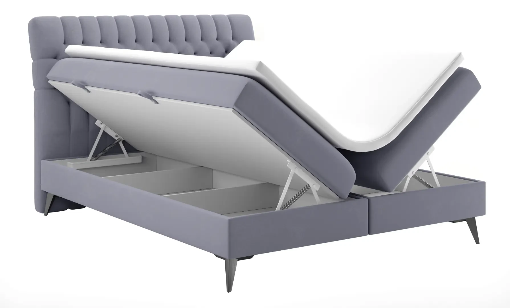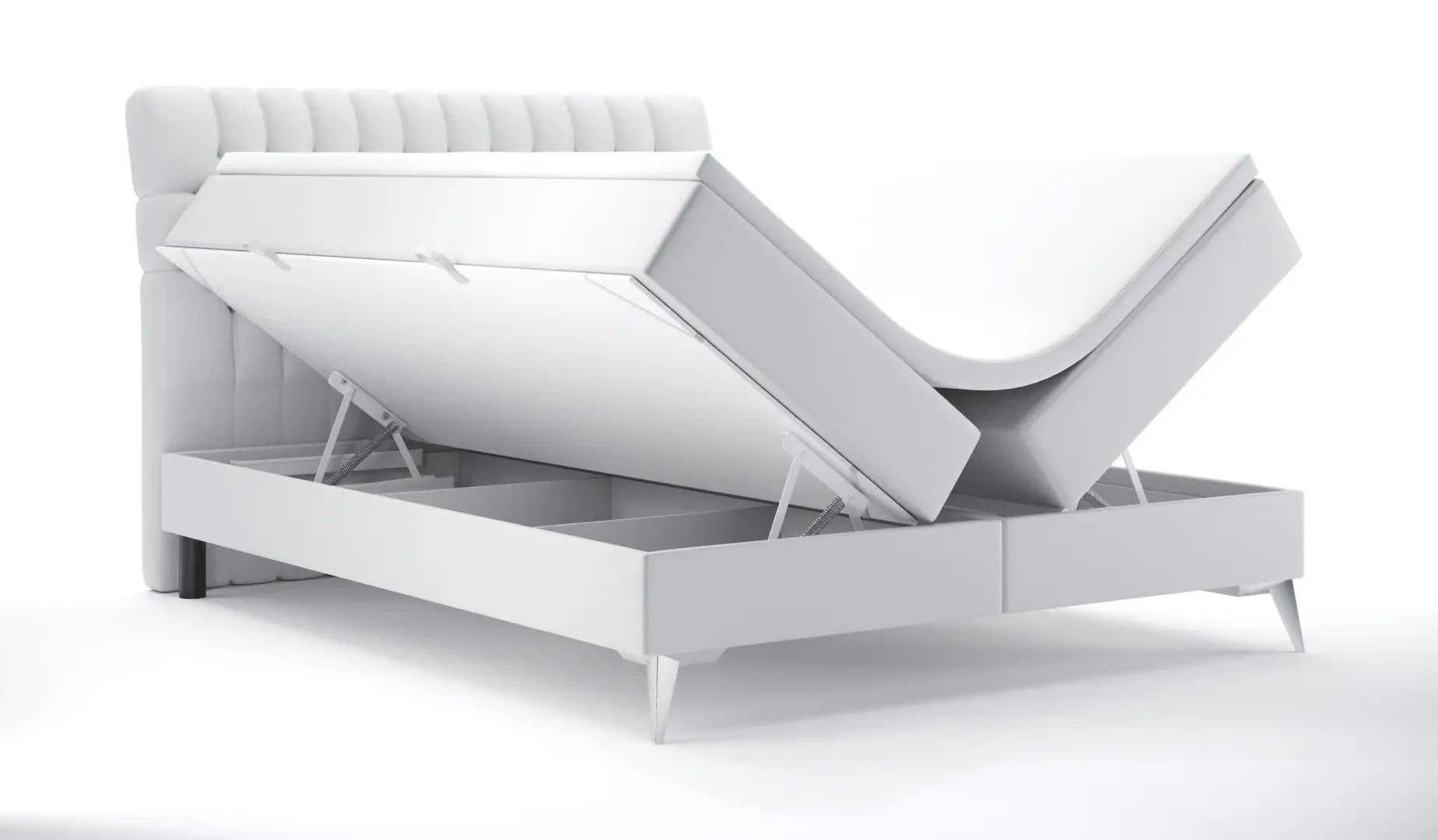 Niezależne materace ze sprężynami typu bonell oraz pianką T-25 jak i wierzchni topper z pianki T-21 zapewniają idealne dopasowanie do kształtu ciała. Dostęp do pojemnych schowków na pościel ułatwiają bezpieczne automaty. Duża wysokość powierzchni spania zmniejsza wysiłek wstawania z łóżka (co jest doskonałą informacja dla osób starszych) oraz sprawia, że w strefie snu znajduje się znacznie mniej roztoczy i zanieczyszczeń, niż w przypadku łóżek niższych. Nie licząc wezgłowia cała powierzchnia łóżka to materac dzięki czemu łóżko zachowuje kompaktowe rozmiary ułatwiając jego wpasowanie nawet w ciaśniejsze sypialnie mieszkań miejskiej dżungli.