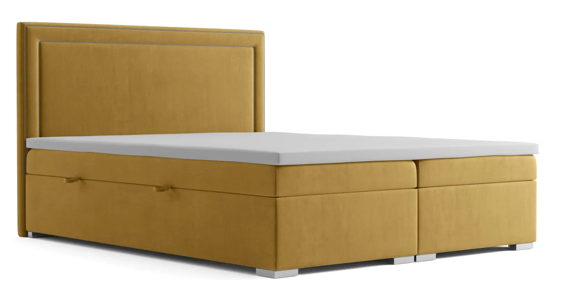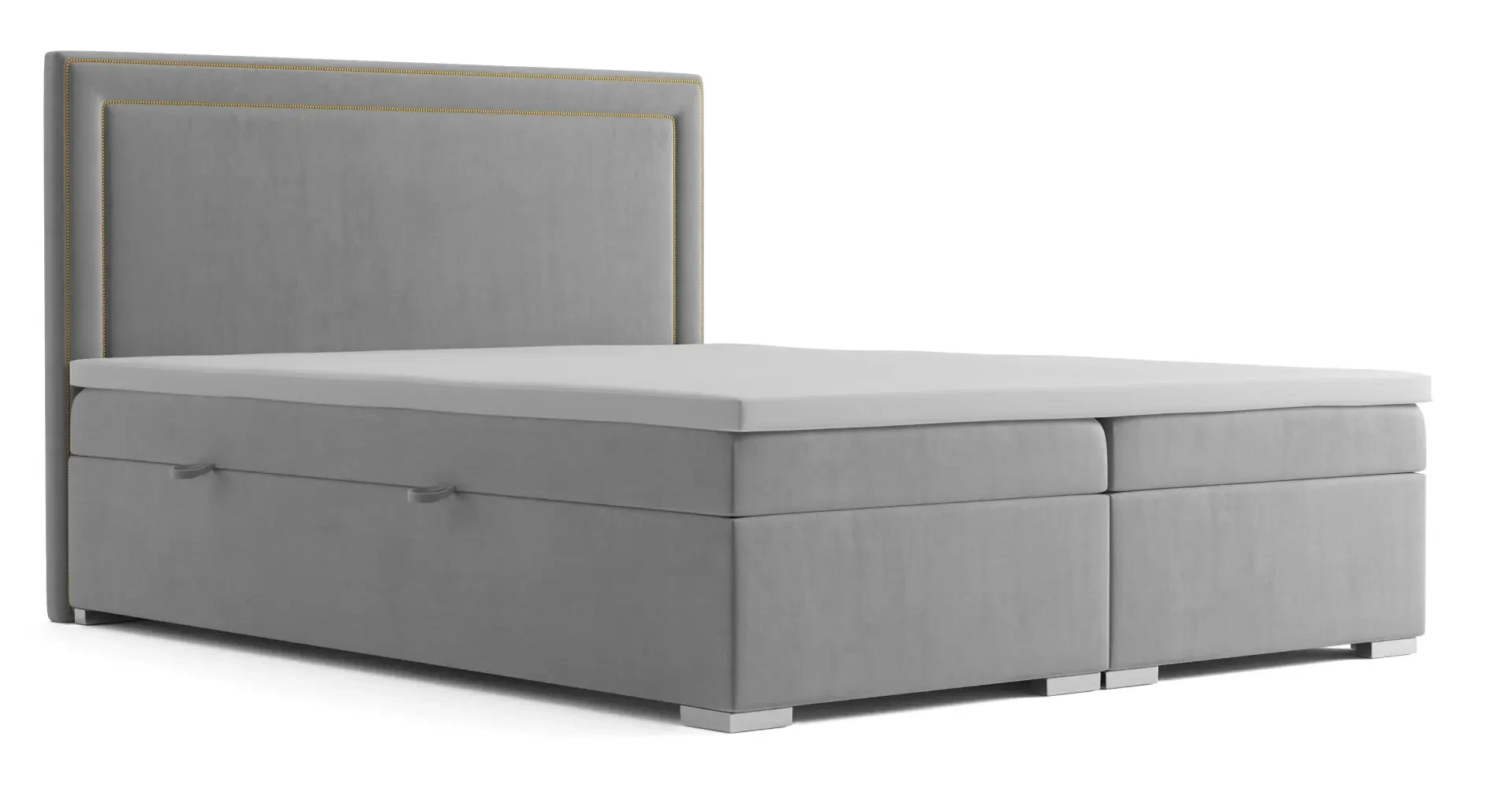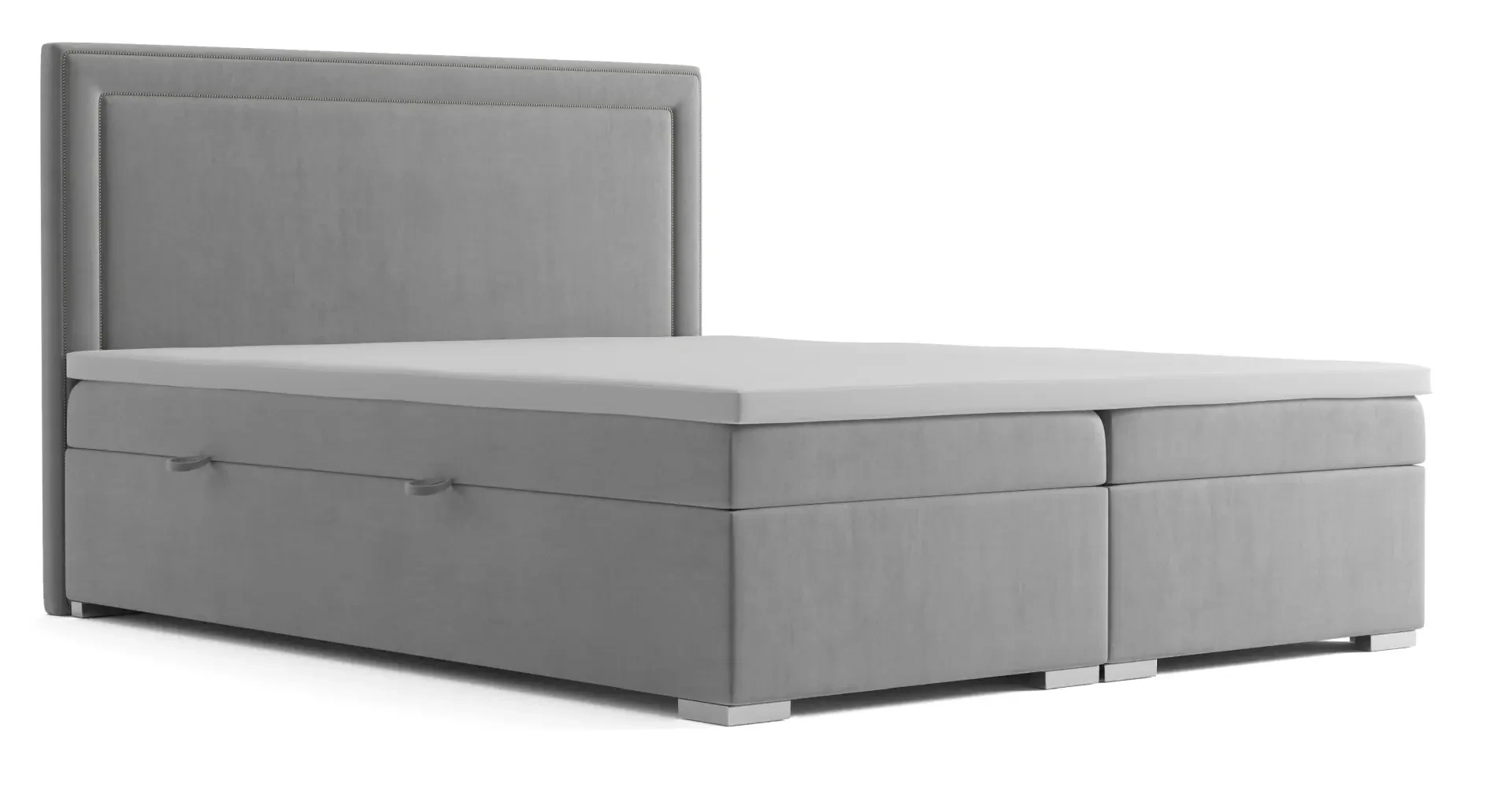Łóżka kontynentalne z serii Quarto z opcją pojemnikiem występują w aż 7 wariantach szerokości oraz wielu tkaninach do wyboru. Wariant o szerokości 180 cm dzięki swoim wymiarom idealnie sprawdzi się jako łóżko sypialniane dla dwóch osób dorosłych. Dzięki zastosowaniu pojedynczego materaca w węższych wersjach i oddzielnych materacy w szerszych stanowi wygodne posłanie i niezależny komfort spania. Klasyczne wezgłowie jest eleganckie i miłe w dotyku dzięki zastosowaniu 3 cm pianki pod tkaniną - nasi Klienci zgłaszają że potrafi nawet nieco wyciszyć odgłosy chrapania ich partnerów ;) Ponadto, oparcie posiada piękną listwę ozdobną w kolorze złota, srebra lub starego złota. Łóżko kontynentalne to wybór dla osób poszukujących eleganckich i masywnych mebli, ceniących komfort i lubiących spać na wyższej niż przeciętne łóżko wysokości.