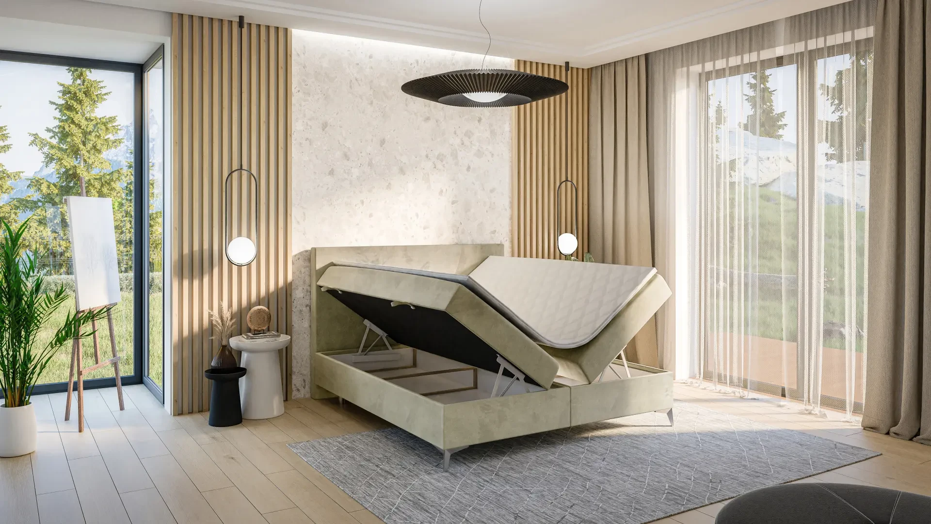 Niezależne materace ze sprężynami typu bonell oraz pianką T-25 jak i wierzchni topper z pianki T-21 zapewniają idealne dopasowanie do kształtu ciała. Dostęp do pojemnych schowków na pościel ułatwiają bezpieczne automaty. Duża wysokość powierzchni spania zmniejsza wysiłek wstawania z łóżka (co jest doskonałą informacja dla osób starszych) oraz sprawia, że w strefie snu znajduje się znacznie mniej roztoczy i zanieczyszczeń, niż w przypadku łóżek niższych. Nie licząc wezgłowia cała powierzchnia łóżka to materac dzięki czemu łóżko zachowuje kompaktowe rozmiary ułatwiając jego wpasowanie nawet w ciaśniejsze sypialnie mieszkań miejskiej dżungli.