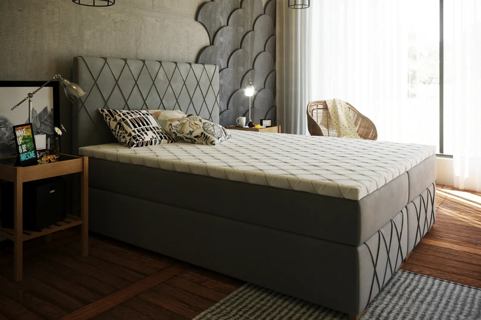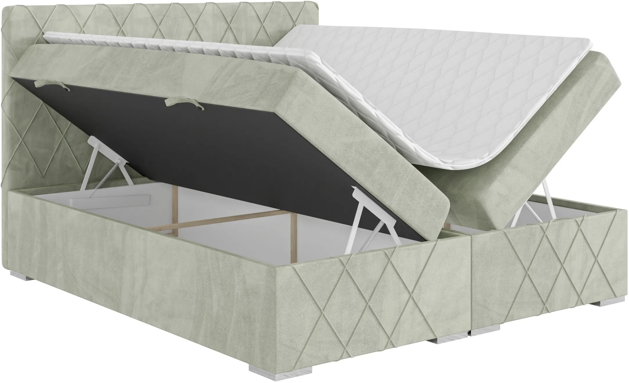 Niezależne materace ze sprężynami typu bonell oraz pianką T-25 jak i wierzchni topper z pianki T-25 zapewniają idealne dopasowanie do kształtu ciała. Dostęp do pojemnych schowków na pościel ułatwiają bezpieczne automaty. Duża wysokość powierzchni spania zmniejsza wysiłek wstawania z łóżka (co jest doskonałą informacja dla osób starszych) oraz sprawia, że w strefie snu znajduje się znacznie mniej roztoczy i zanieczyszczeń, niż w przypadku łóżek niższych. Nie licząc wezgłowia cała powierzchnia łóżka to materac dzięki czemu łóżko zachowuje kompaktowe rozmiary ułatwiając jego wpasowanie nawet w ciaśniejsze sypialnie mieszkań miejskiej dżungli.