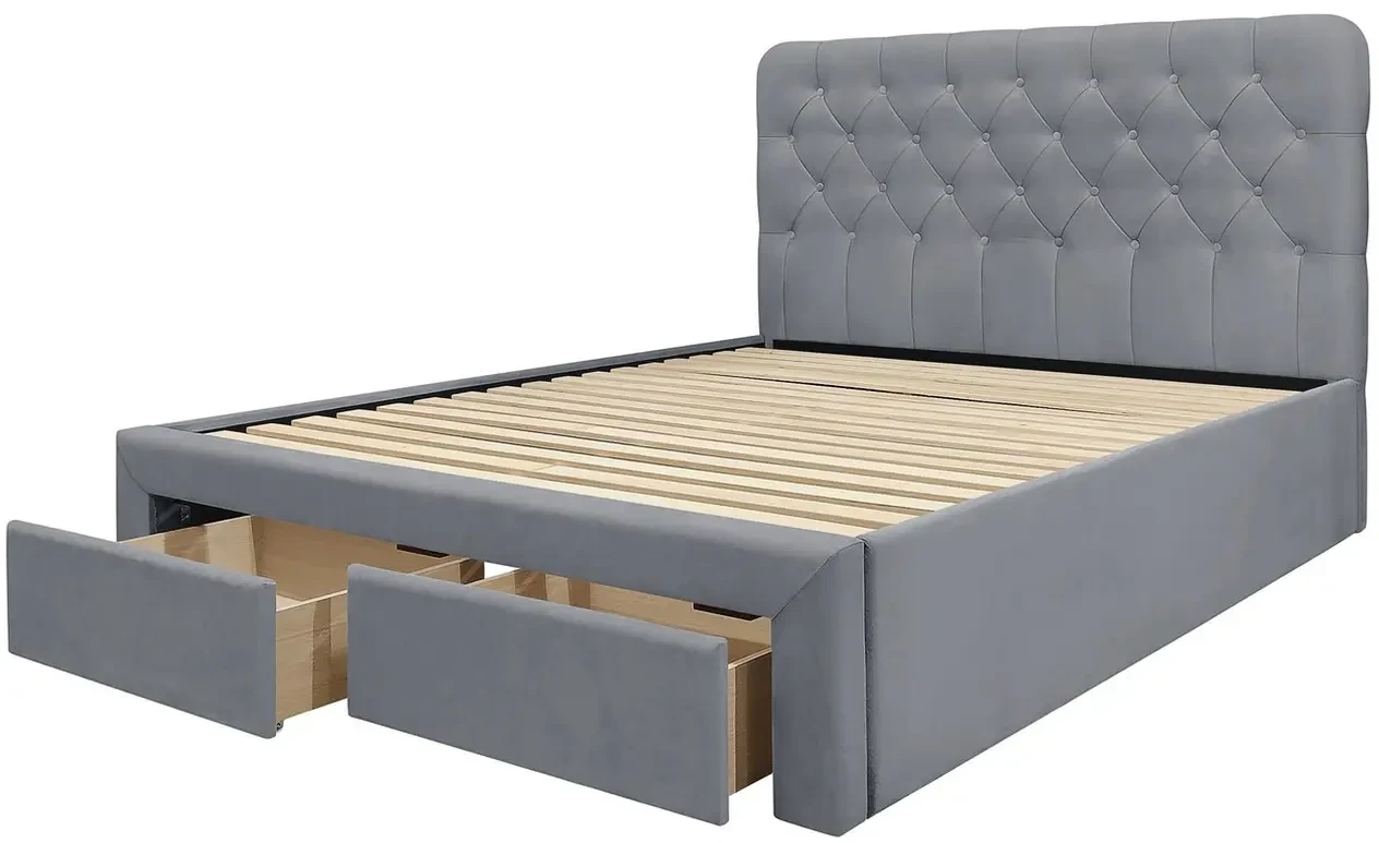 Model został wyposażony w pojemne szuflady, które zapewniają dodatkowe miejsce do przechowywania pościeli czy tekstyliów, co czyni go rozwiązaniem łączącym funkcjonalność z estetyką. Wysokie wezgłowie z ozdobnym przeszyciem wprowadza do wnętrza wrażenie przytulności i komfortu.