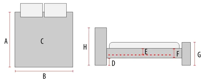 - G. Wysokość frontu łóżka od podłogi: 34 cm