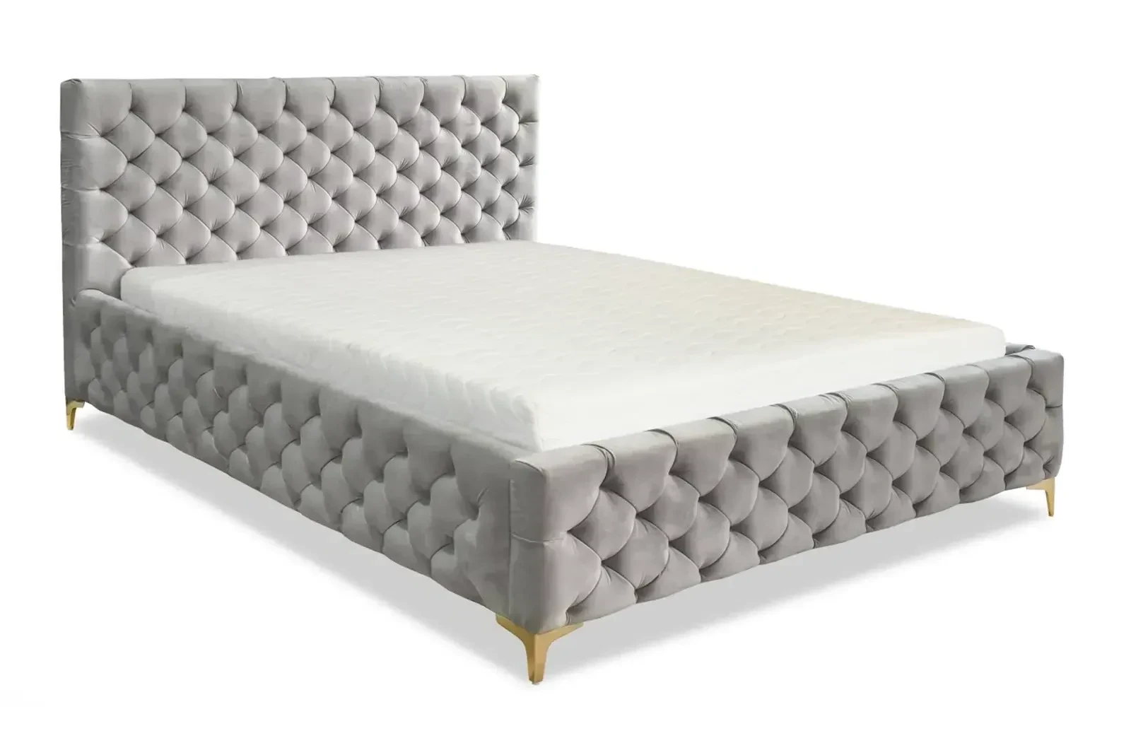 - luksus i elegancja: głębokie pikowania na całej powierzchni łóżka nadają mu wyjątkowy, designerski charakter. Wysokie, metalowe nóżki w odcieniu złota dodają subtelności i luksusowego wykończenia, czyniąc je centralnym punktem każdej sypialni.