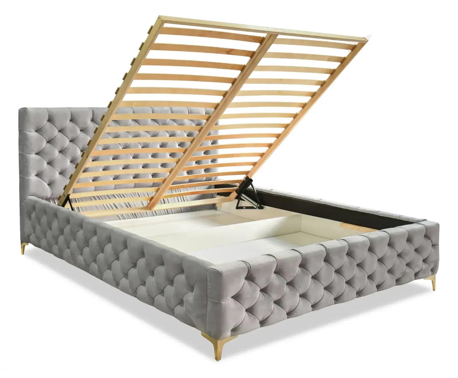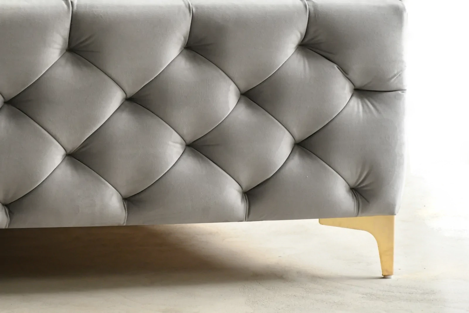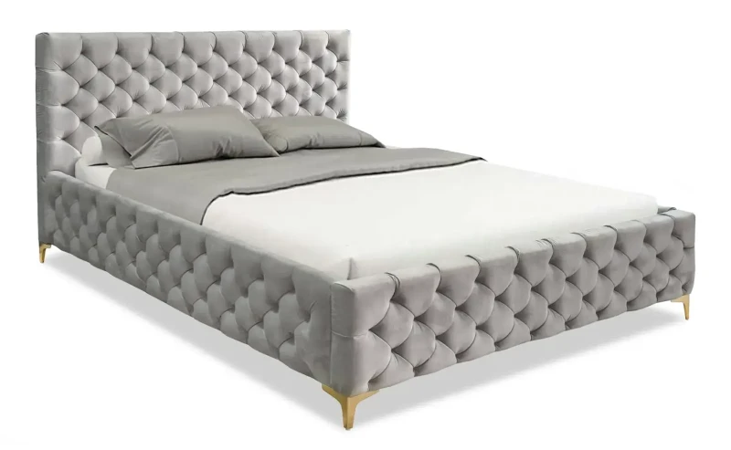 - luksus i elegancja: głębokie pikowania na całej powierzchni łóżka nadają mu wyjątkowy, designerski charakter. Wysokie, metalowe nóżki w odcieniu złota dodają subtelności i luksusowego wykończenia, czyniąc je centralnym punktem każdej sypialni.
