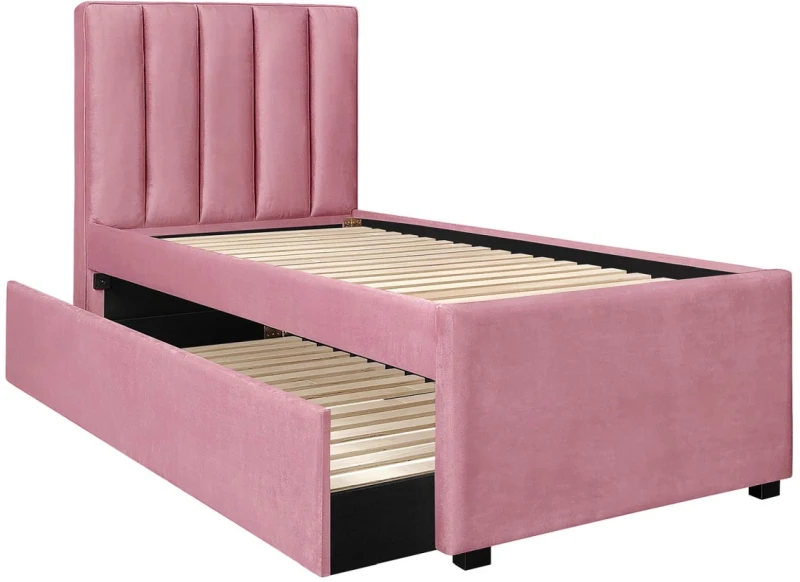 Szukasz idealnego łóżka dla dziecka, nastolatka lub gościnnego pokoju, które nie tylko pięknie wygląda, ale również zapewnia wygodę i dodatkowe miejsce do spania? Model RUSSO 90 cm w subtelnym, różowym kolorze spełni te oczekiwania. To łóżko, które zachwyca nie tylko eleganckim designem, ale także przemyślaną konstrukcją. Tapicerowane przyjemnym w dotyku welwetem, wnosi do wnętrza nutę przytulności i nowoczesnego szyku. Pionowe przeszycia na zagłówku dodają mu klasy i elegancji, czyniąc je efektownym elementem dekoracyjnym. Największym atutem łóżka RUSSO jest wysuwana, dolna część z miejscem na drugi materac – to świetne rozwiązanie, gdy pojawią się goście lub potrzeba dwóch miejsc do spania na co dzień. Stabilna rama i drewniane listwy gwarantują trwałość konstrukcji oraz odpowiednie podparcie dla materacy. RUSSO to więcej niż tylko łóżko – to mebel, który łączy wygodę z estetyką, idealny do nowoczesnych aranżacji.