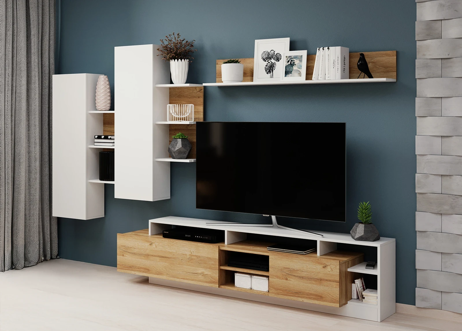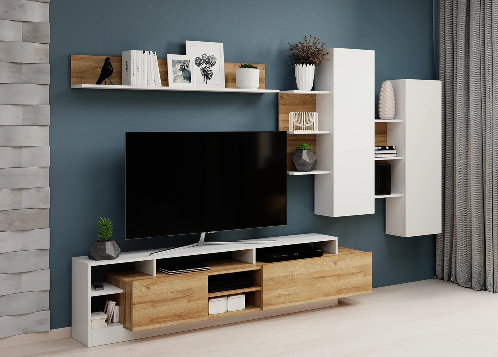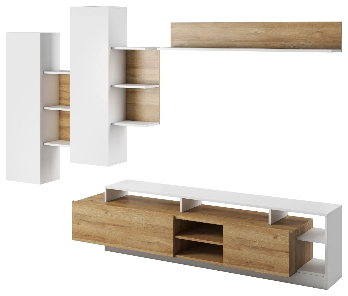 Wprowadź nowoczesność i elegancję do swojego salonu z meblościanką Alva. Ten stylowy zestaw wykonany jest z wysokiej jakości płyty laminowanej, która gwarantuje trwałość i wysoką odporność na uszkodzenia. Meble wykończone są w modnym, matowym odcieniu dębu grandson i bieli, co nadaje im nowoczesny i elegancki wygląd. Powierzchnie mebli są łatwe do czyszczenia, co pozwala zachować ich estetyczny wygląd przez długi czas. Fronty w odcieniach dębu dodają naturalnego ciepła, a białe elementy podkreślają jej nowoczesny charakter. Meblościanka Alva składa się z niezależnych od siebie elementów, co pozwala na dowolne ich rozmieszczenie zgodnie z indywidualnymi potrzebami i preferencjami. Dzięki temu możesz łatwo dostosować układ mebli do swojego wnętrza, tworząc unikalne aranżacje. Dodaj meblościankę Alva do swojego koszyka i ciesz się elegancją oraz funkcjonalnością, które wprowadzi do Twojego domu. Mebel został zaprojektowany i wykonany w Polsce co jest gwarancją jakości - Wspieraj