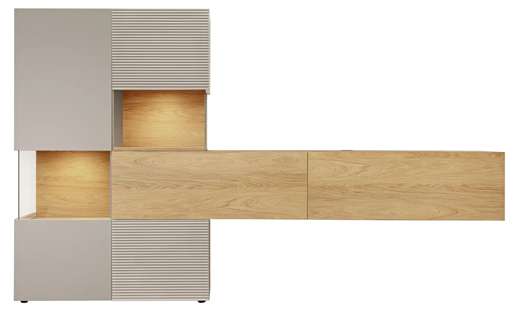 Meblościanka Brick to kompaktowa propozycja która sprawdzi się w mniejszych pomieszczeniach jak niewielkich mieszkaniach, kawalerkach czy pokojach młodzieżowych. Meblościanka została wykonana z płyty, która zapewnia wysoką odporność na zarysowania oraz promienie słoneczne, dzięki temu zachowa swój atrakcyjny wygląd przez długi czas. Meblościanka Brick doskonale wpasuje się do nowoczesnego salonu, podkreślając niepowtarzalny i unikatowy styl pomieszczenia, a czerń matowa i ryflowana w połączeniu z płytą w kolorze hickory natura stworzą elegancką i nietuzinkową kombinacje. . Zastosowanie oświetlenia LED w przeszklonych półkach pozwoli wyeksponować przedmioty na których nam zależy.