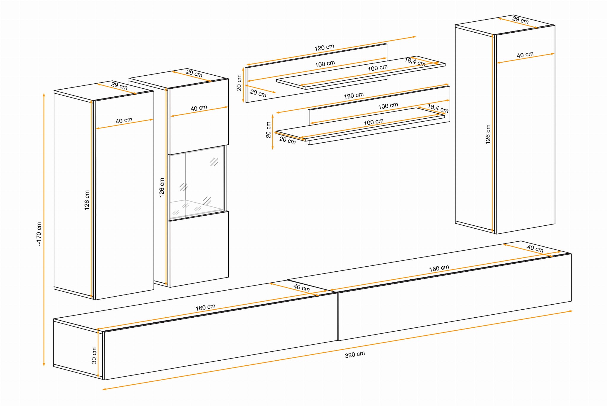 - Szafka RTV (2 sztuki): Szerokość 160 cm, wysokość 30 cm, głębokość 40 cm