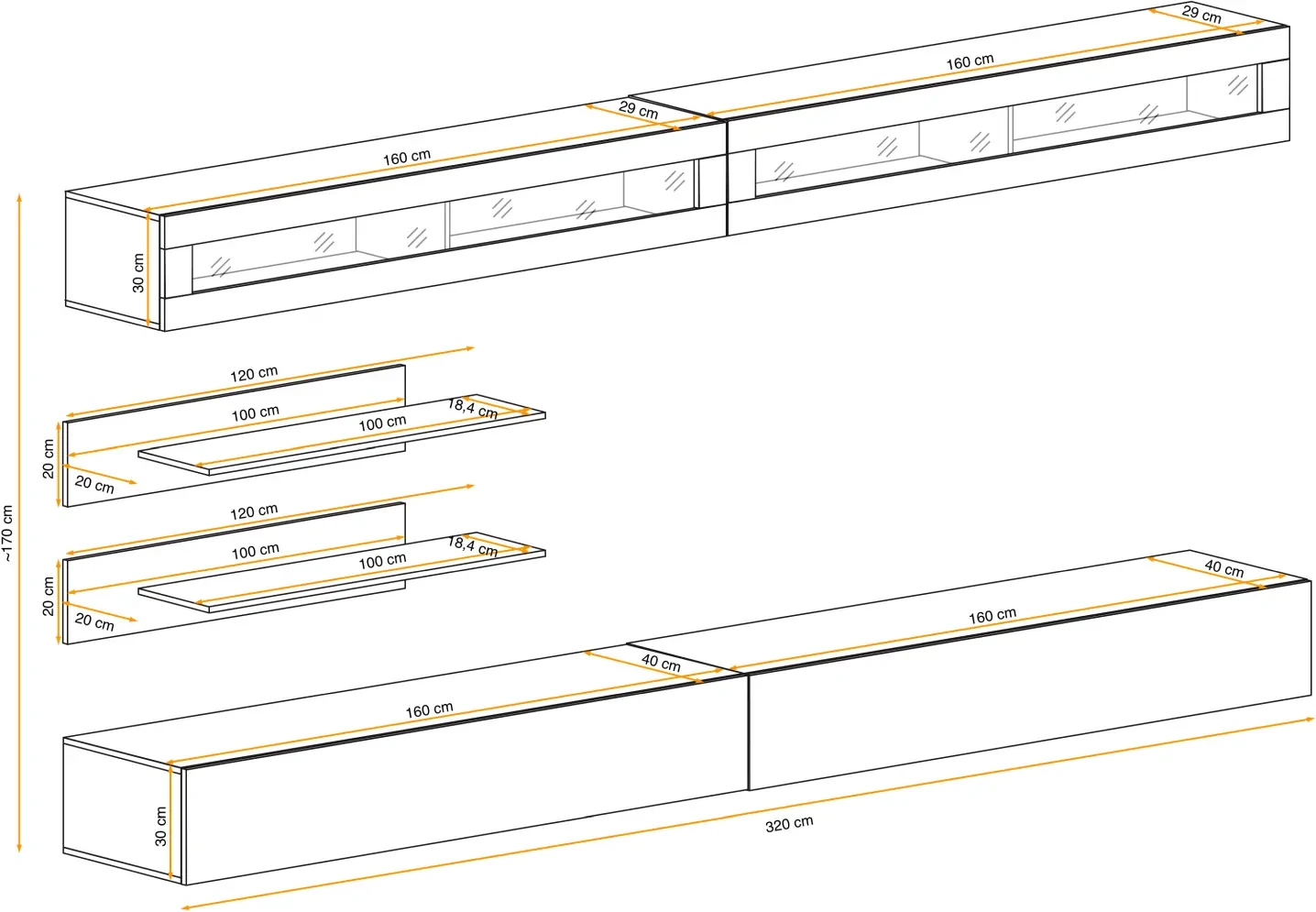 - Szafki RTV (2 sztuki): Szerokość 160 cm, wysokość 30 cm, głębokość 40 cm