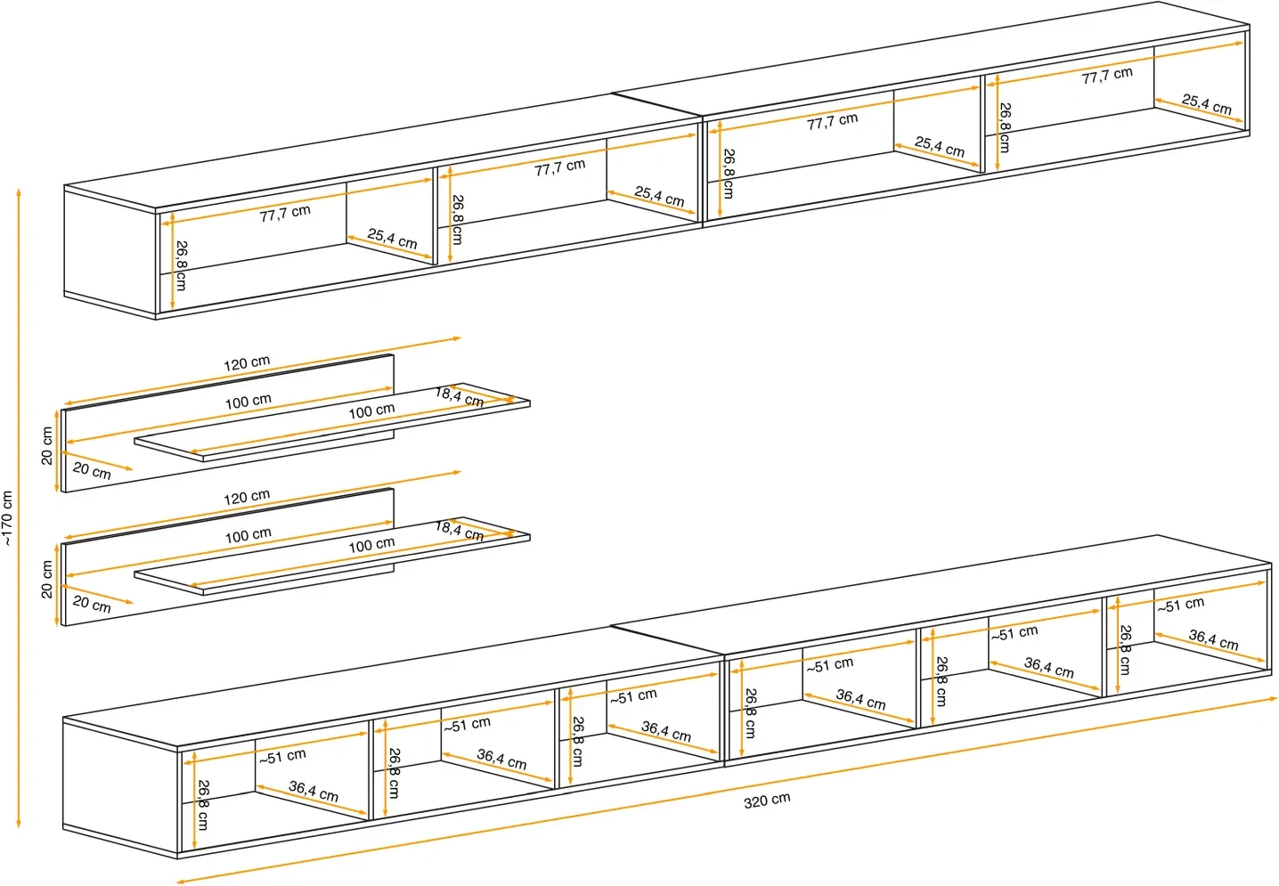 - Całość: Szerokość 320 cm, wysokość ~180 cm, głębokość 40 cm