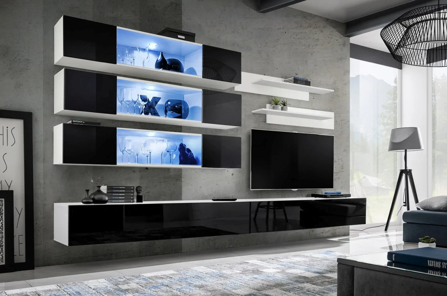 - System push-click: Innowacyjny system otwierania push-click sprawia, że meblościanka jest wygodna w użytkowaniu. Brak widocznych uchwytów pozwala na zachowanie minimalistycznej estetyki, podkreślając nowoczesny design mebla.