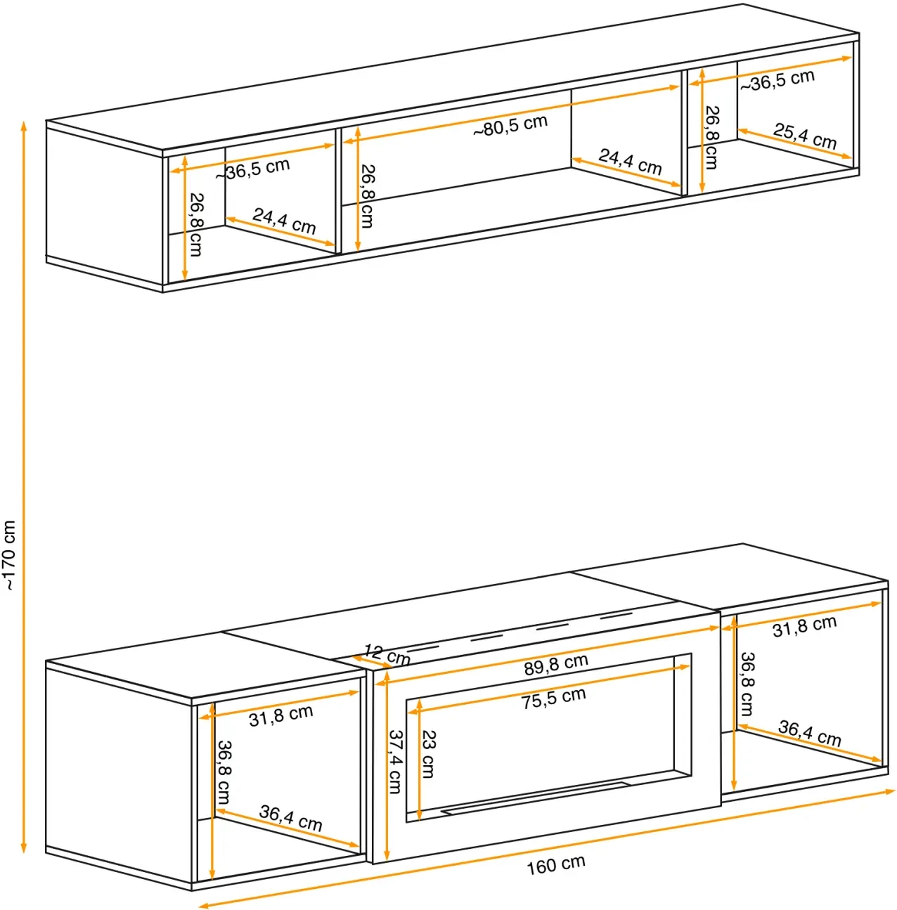 - Komoda wisząca: Szerokość 160 cm, wysokość 40 cm, głębokość 40 cm