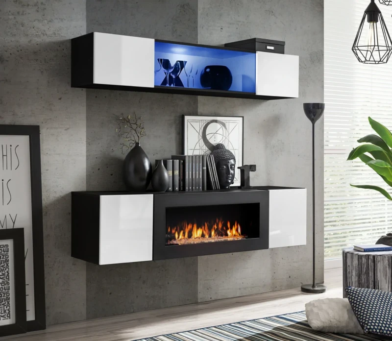 Meblościanka Fly N3 z biokominkiem oświetlenie LED zestaw 2 elementy do salonu