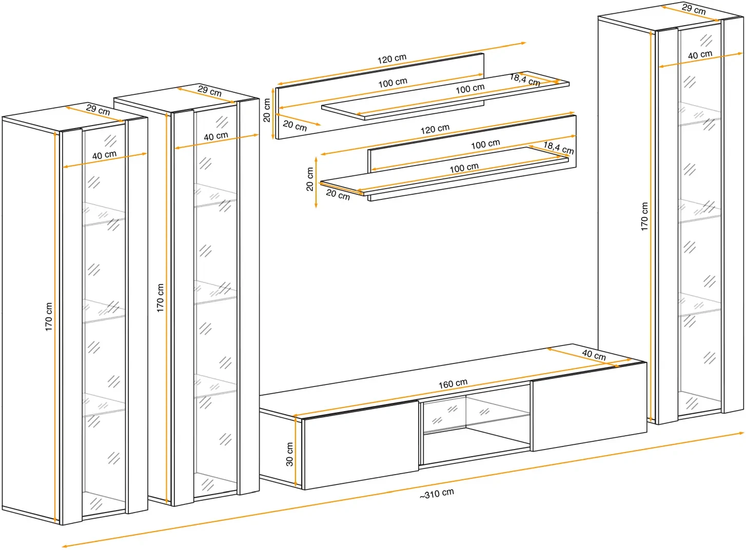 - Witryna (3 sztuki): Szerokość 40 cm, wysokość 170 cm, głębokość 29 cm