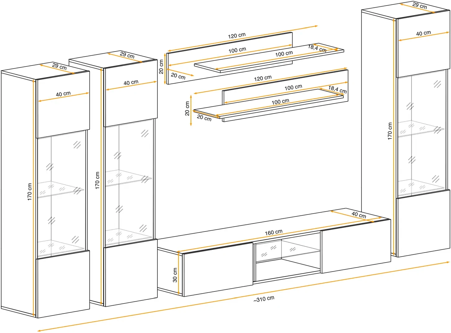 - Witryna (3 sztuki): Szerokość 40 cm, wysokość 170 cm, głębokość 29 cm