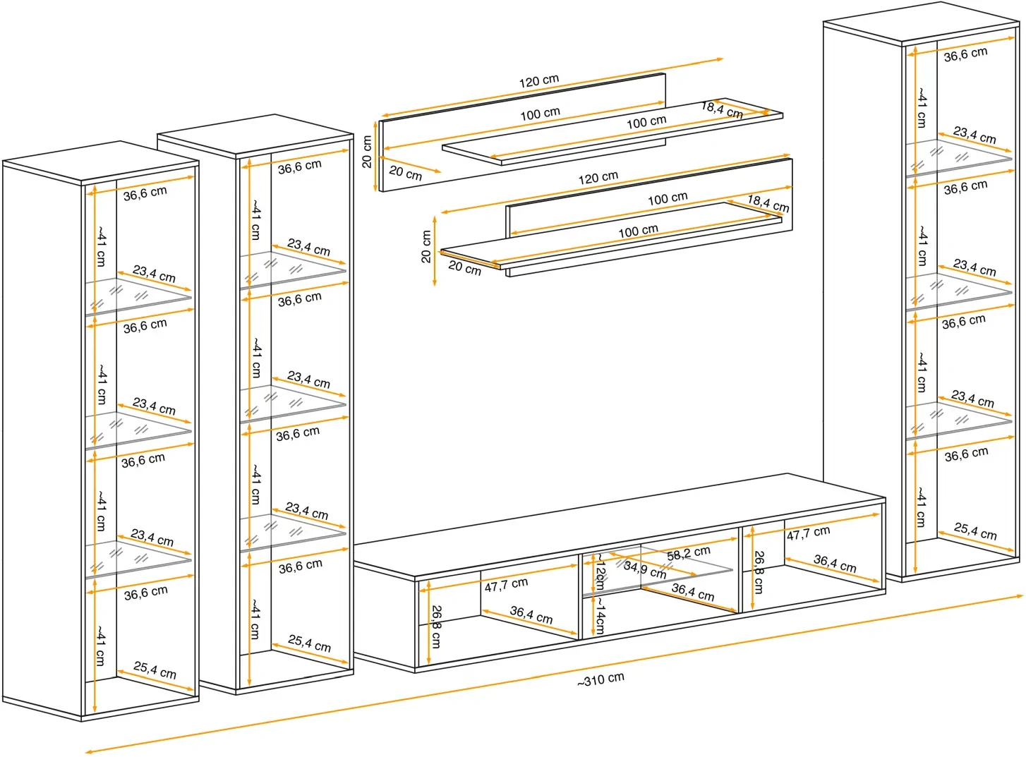 - Całość: Szerokość ~310 cm, wysokość 170 cm, głębokość 40 cm