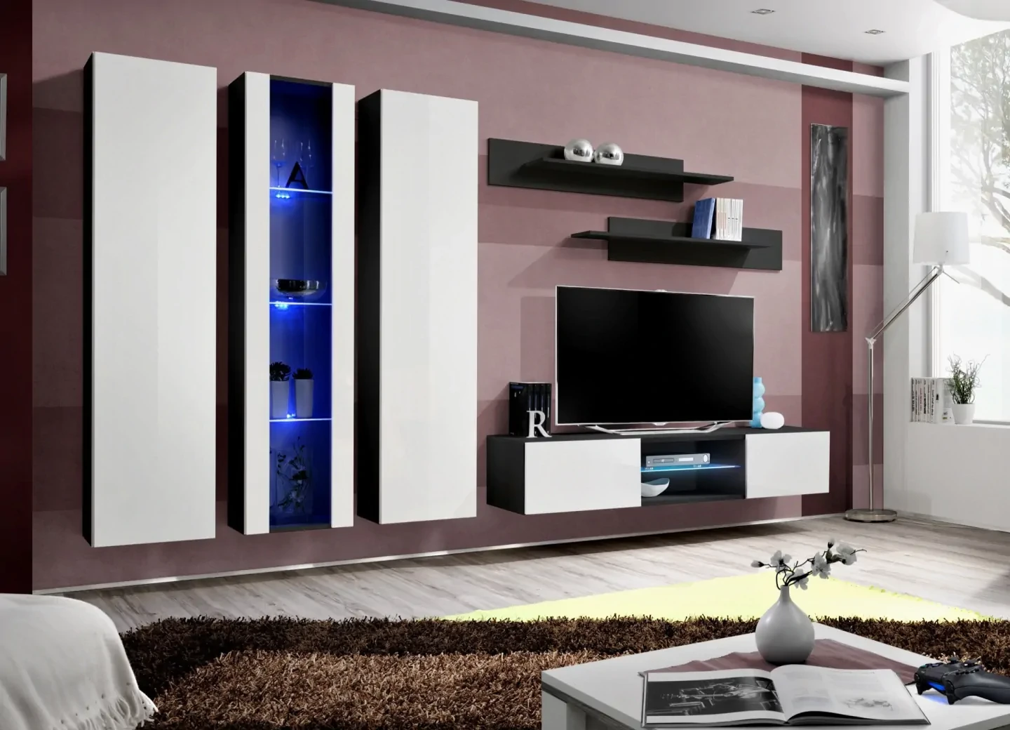 - Szafka RTV: Posiada dwie klapy otwierane na rozwórki. Za każdą klapą znajduje się przestronna komora, natomiast pośrodku znajduje się otwarta komora przedzielona półką podświetloną niebieskim LED, co dodaje jej wyjątkowego charakteru.