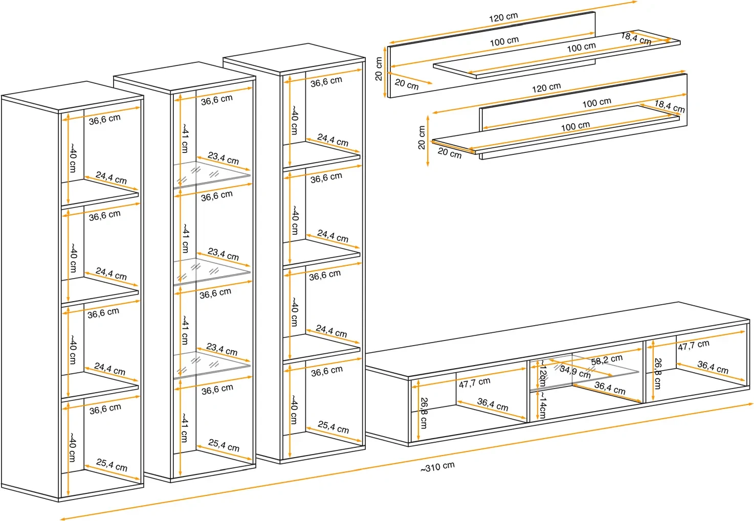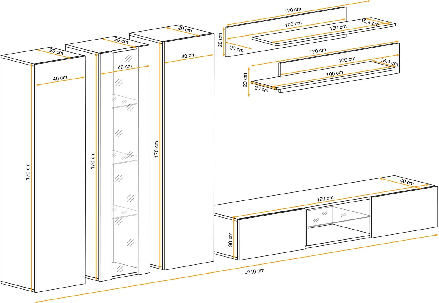 - Całość: Szerokość ~310 cm, wysokość 170 cm, głębokość 40 cm
