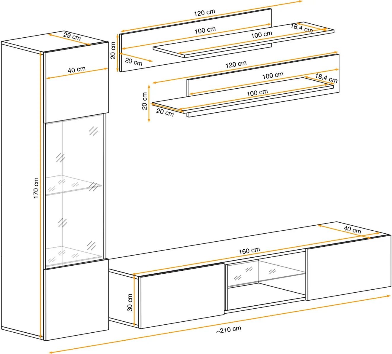 - Szafka RTV: 160 cm szerokości, 30 cm wysokości, 40 cm głębokości