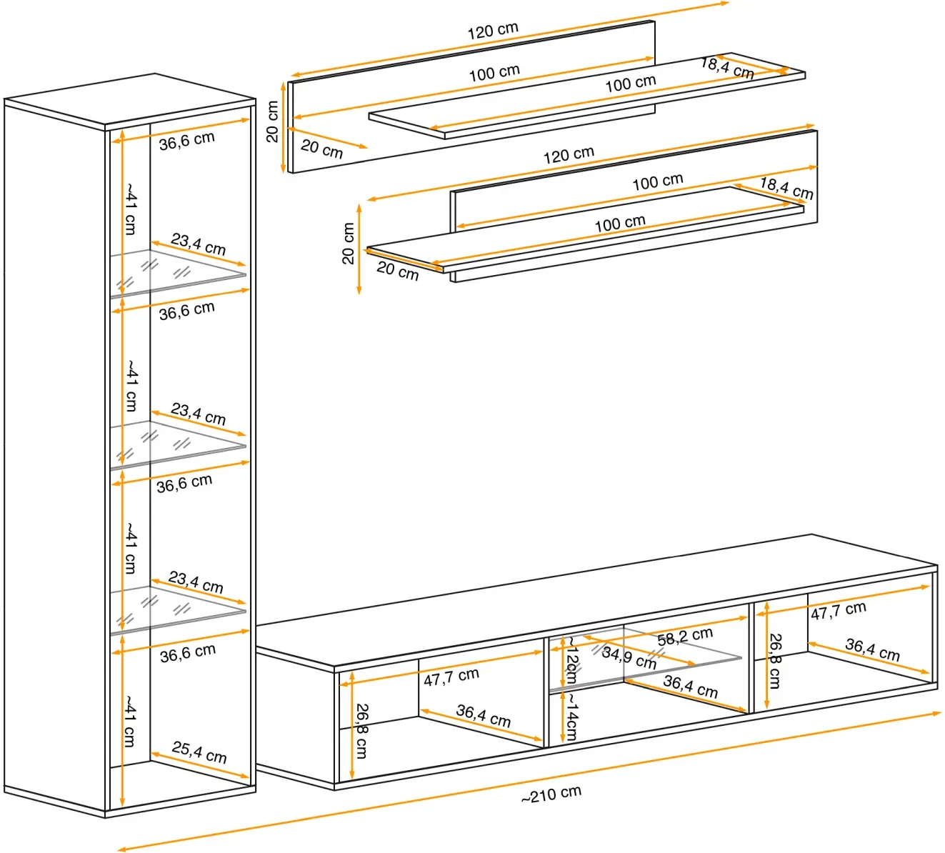 - Półki: 100-120 cm szerokości, 20 cm wysokości, 20 cm głębokości