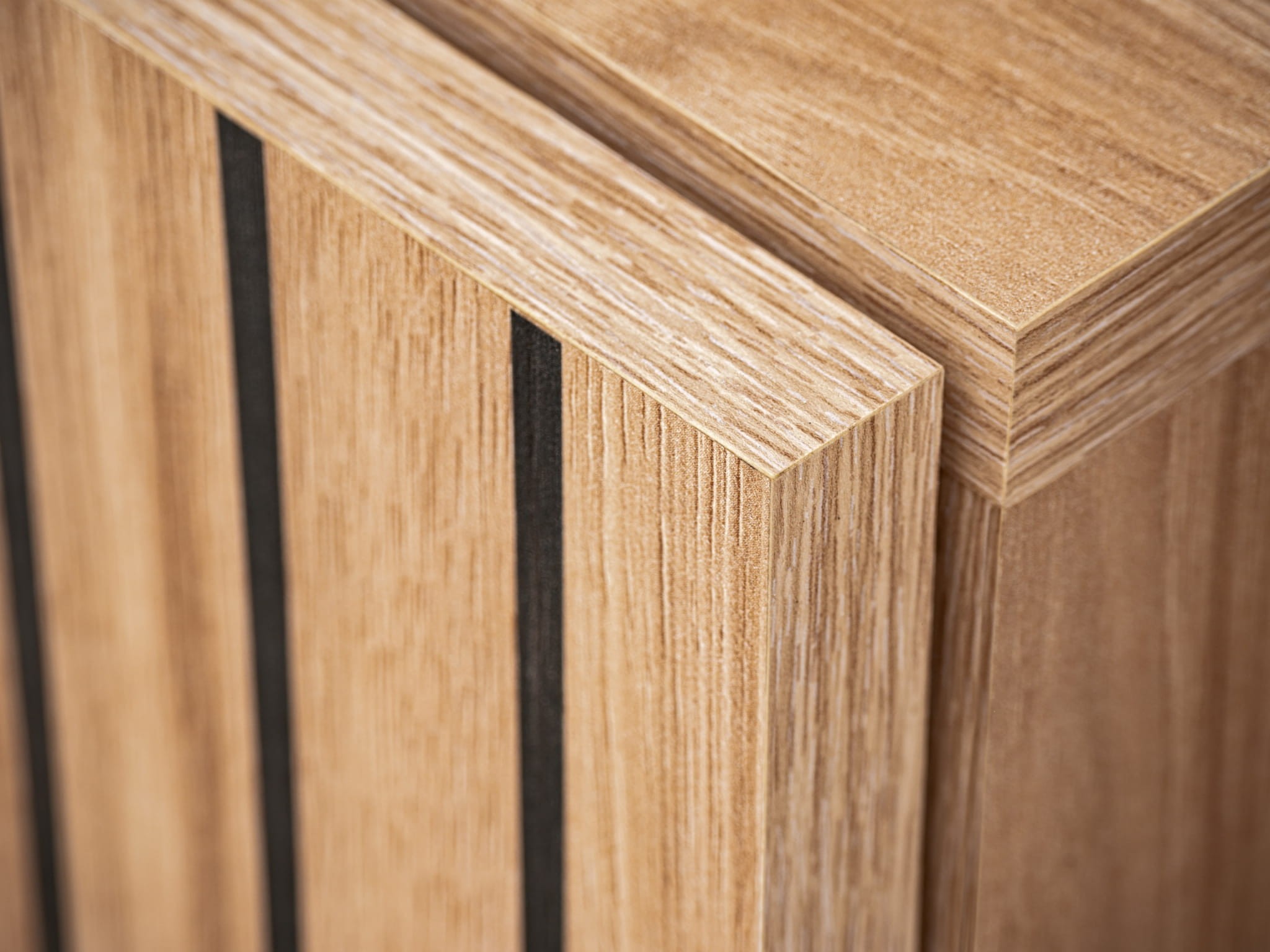 - Fronty: płyta laminowana z nadrukiem czarnych pasków, czarne aluminiowe ramki