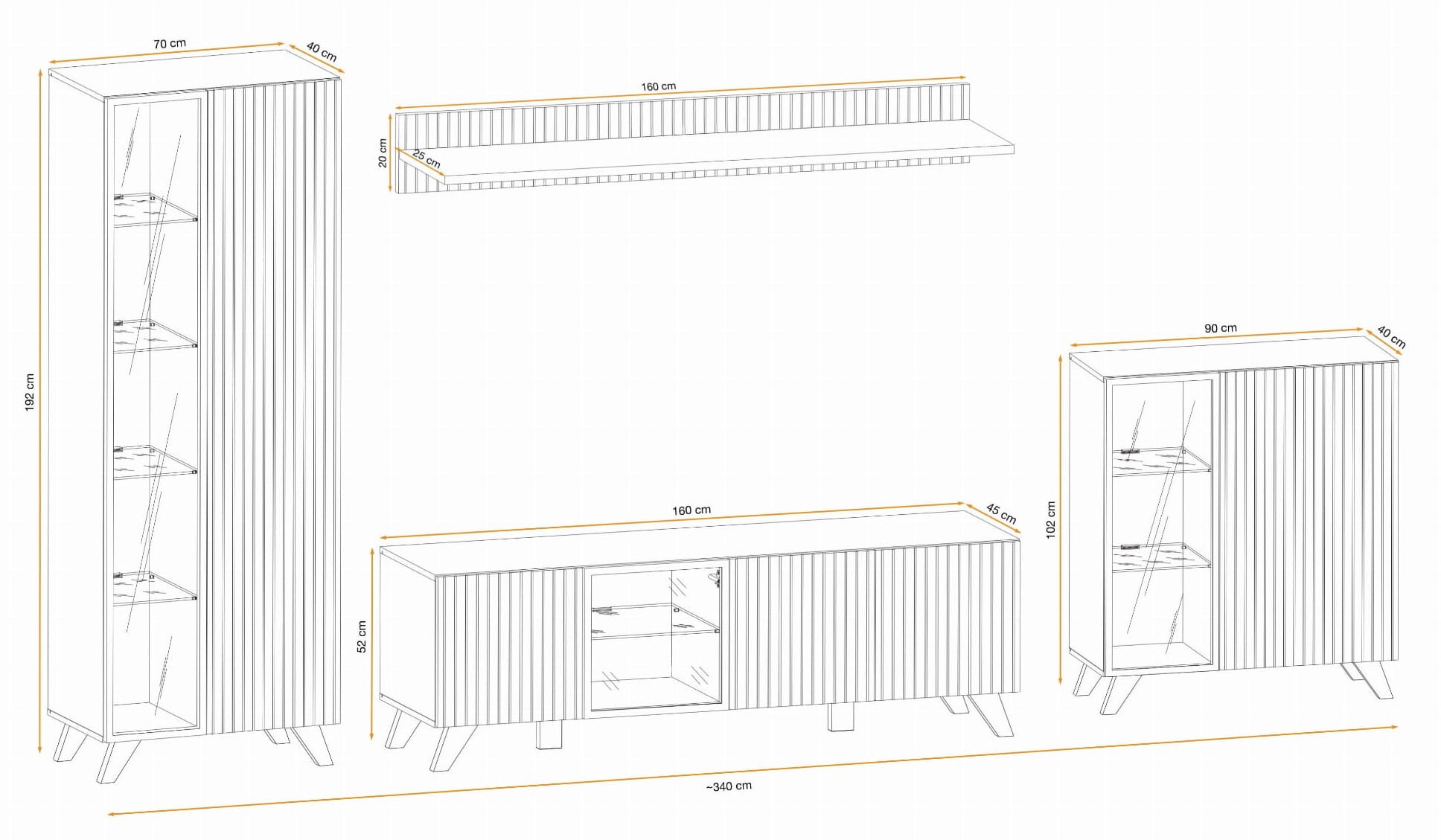 - Szafka RTV: Szerokość 160 cm, wysokość 52 cm, głębokość 45 cm