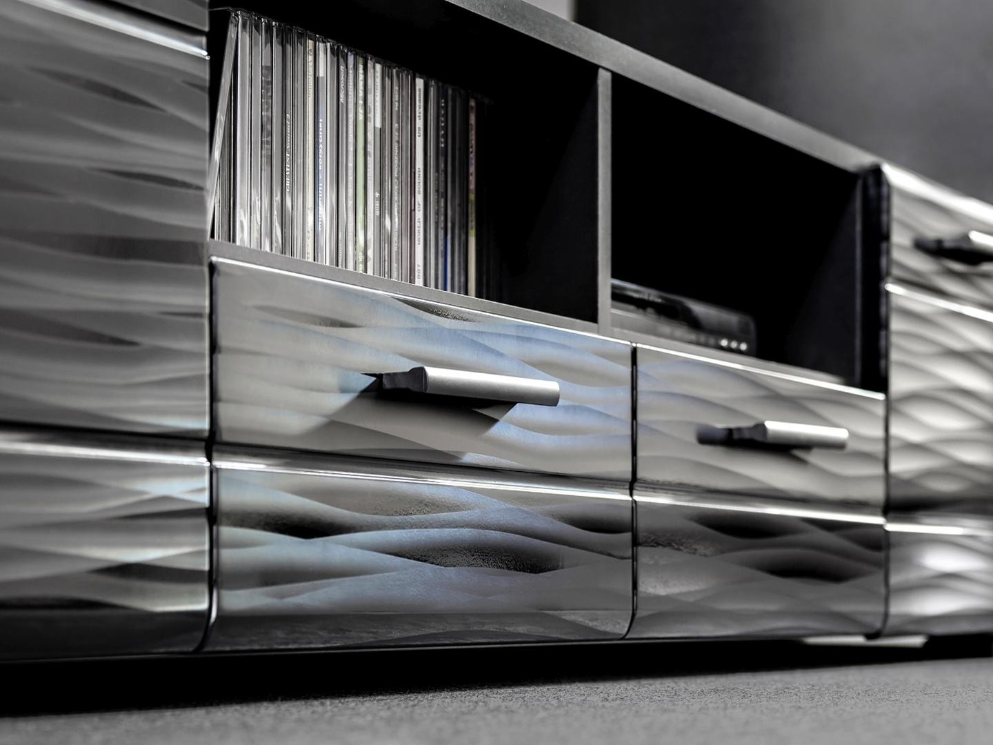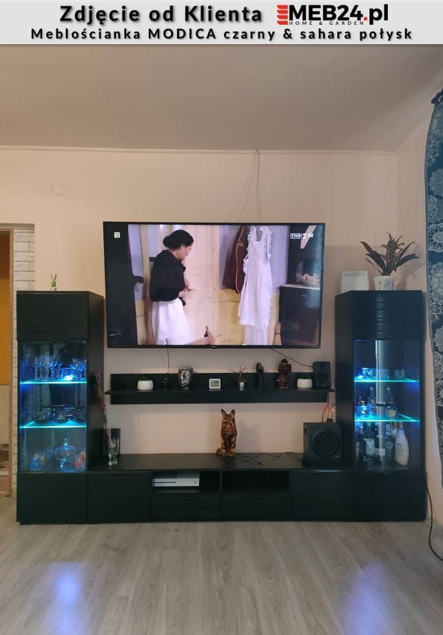 Meblościanka MODICA dzięki zastosowaniu nowoczesnego dekoru 3D, spełnia oczekiwania dla wszystkich, którzy preferują nowoczesny a zarazem odważny design. Meblościanka została wykonana z płyty laminowanej, która zapewnia wysoką odporność na zarysowania oraz promienie słoneczne, dzięki temu zachowa swój atrakcyjny wygląd przez długi czas. Meblościanka MODICA doskonale wpasuje się do awangardowego salonu, podkreślając niepowtarzalny i unikatowy styl pomieszczenia.