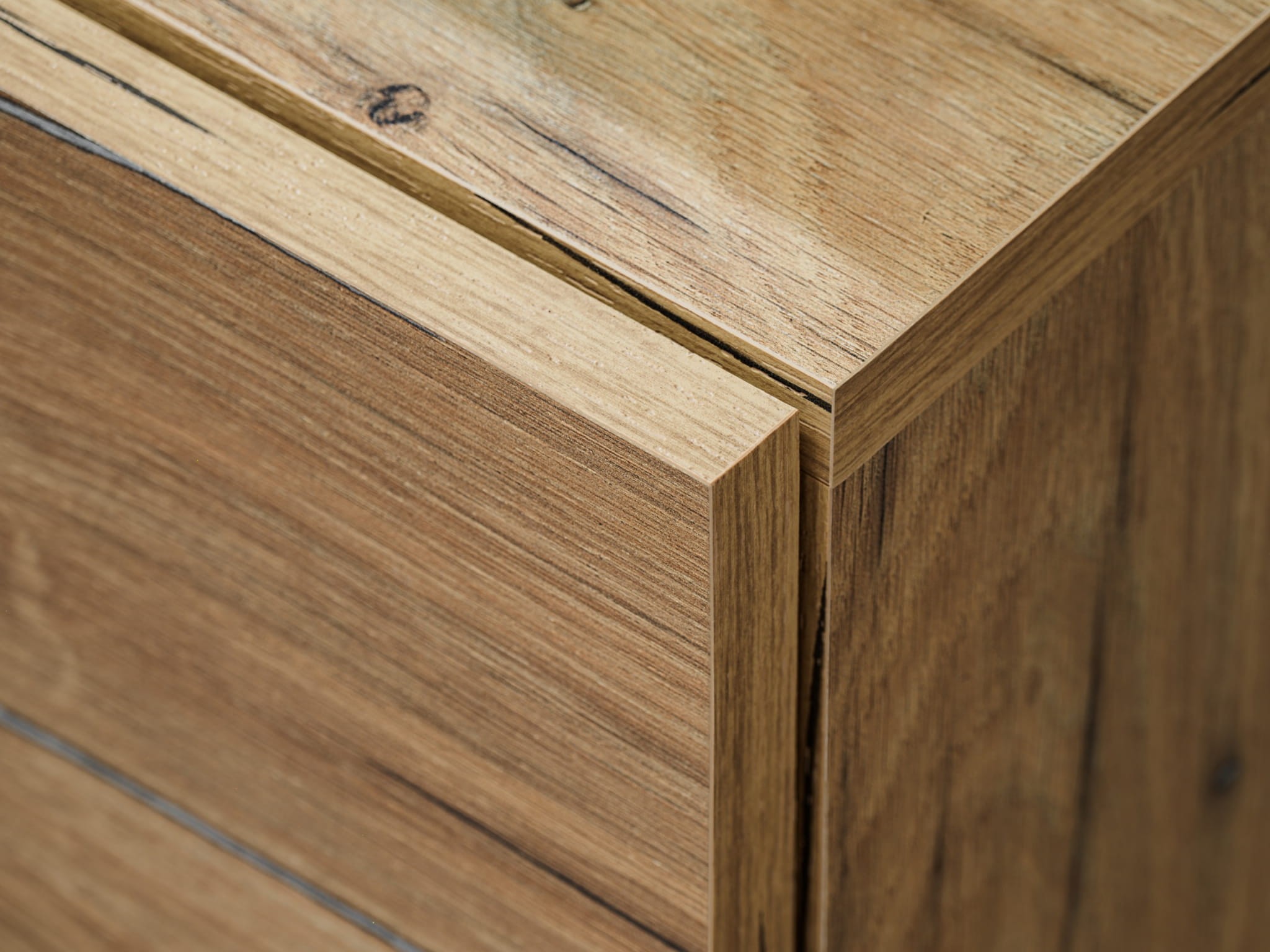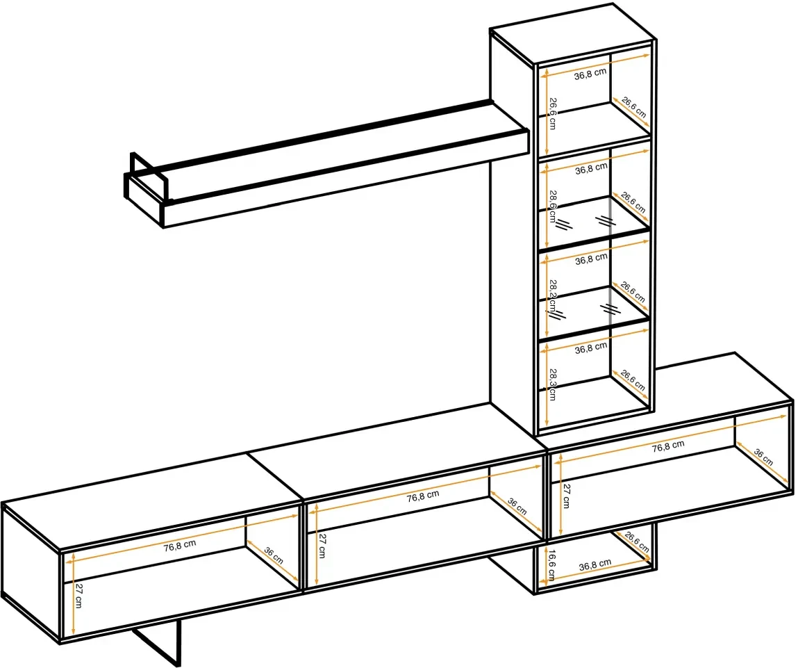 - Wysoka jakość wykonania i trwałość: Korpus meblościanki wykonany jest z laminowanej płyty meblowej oraz szkła, a stopki z metalu, co gwarantuje trwałość i stabilność konstrukcji. Fronty również wykonane są z laminowanej płyty i szkła, zapewniając elegancki wygląd oraz odporność na uszkodzenia. Wykończenie w matowym stylu nadaje meblowi nowoczesnego charakteru, jednocześnie ułatwiając utrzymanie go w czystości.