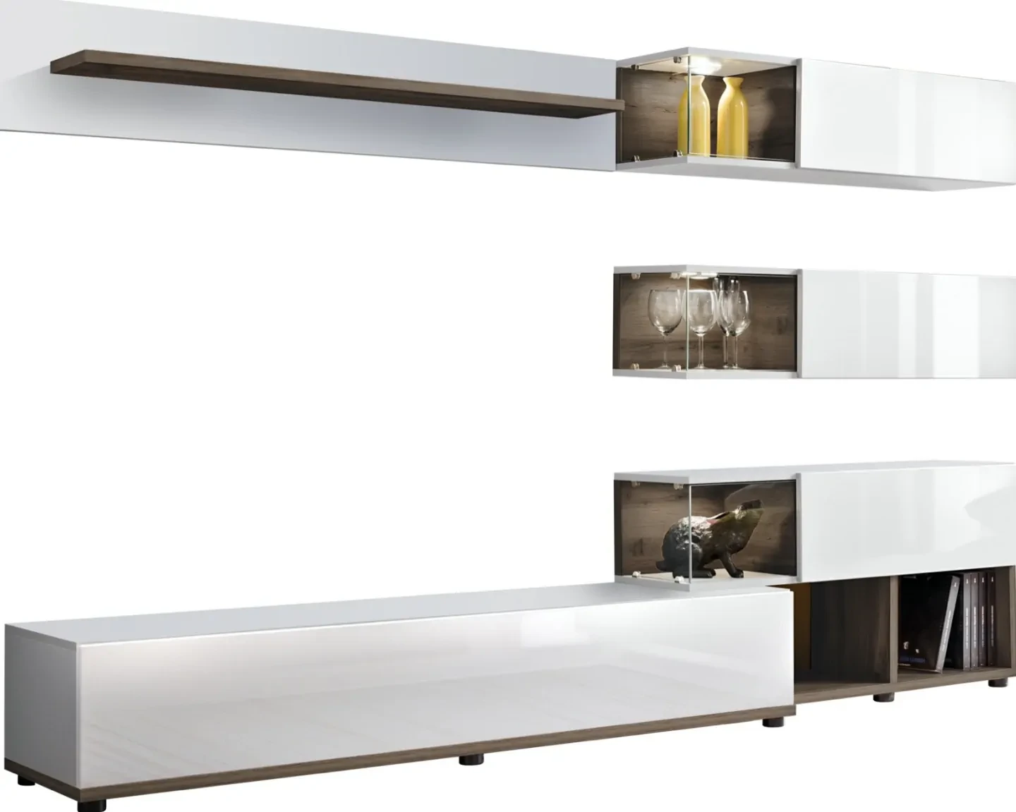 - Nowoczesny design z oświetleniem LED: Przeszklone witryny z podświetleniem LED to nie tylko estetyczny detal, ale także funkcjonalny dodatek, który nadaje wnętrzu przytulny charakter i eksponuje umieszczone wewnątrz przedmioty. Podświetlenie LED w białym kolorze dodaje całości elegancji i nowoczesnego stylu.