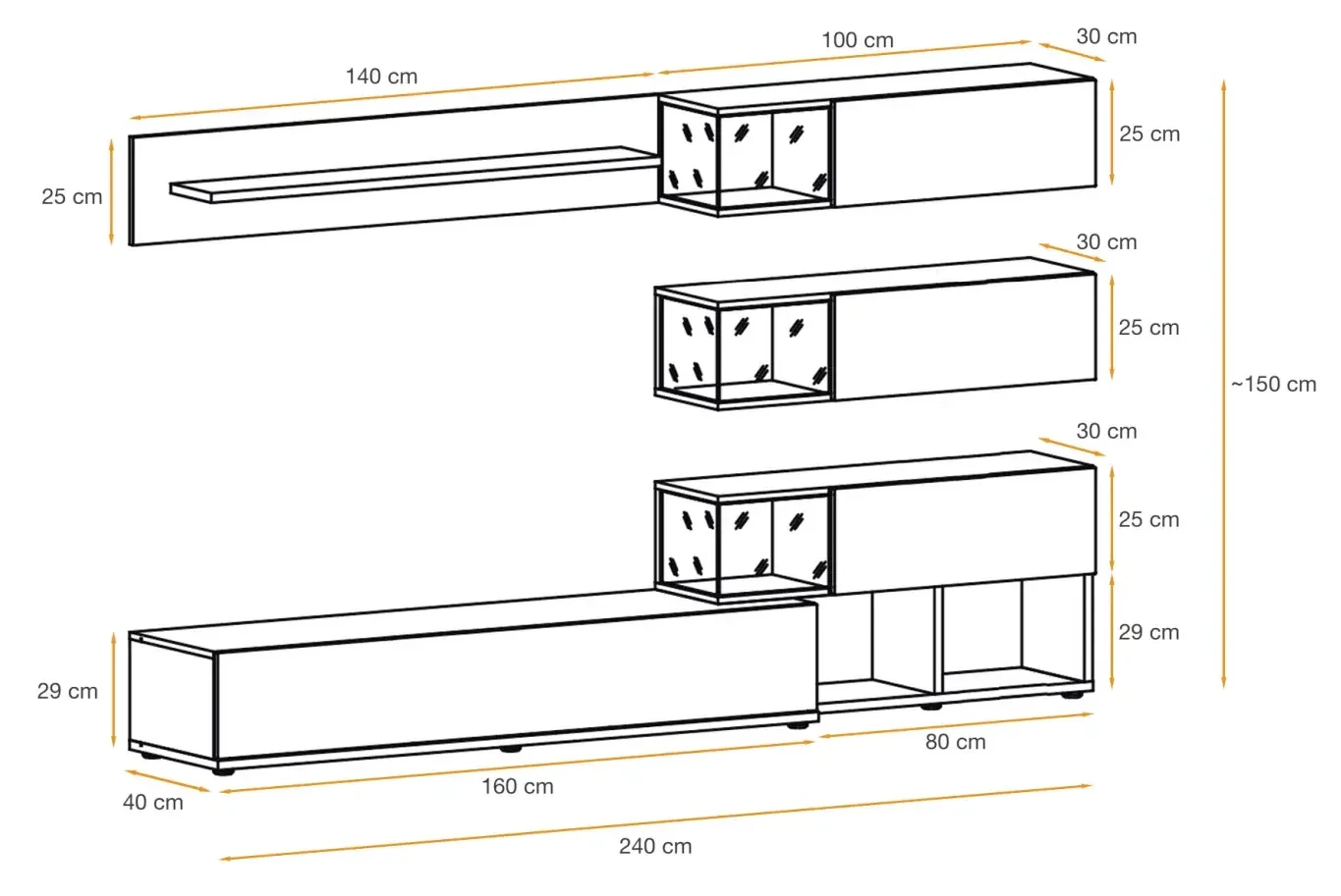 - RTV: 160 cm (szer.) x 29 cm (wys.) x 40 cm (gł.)