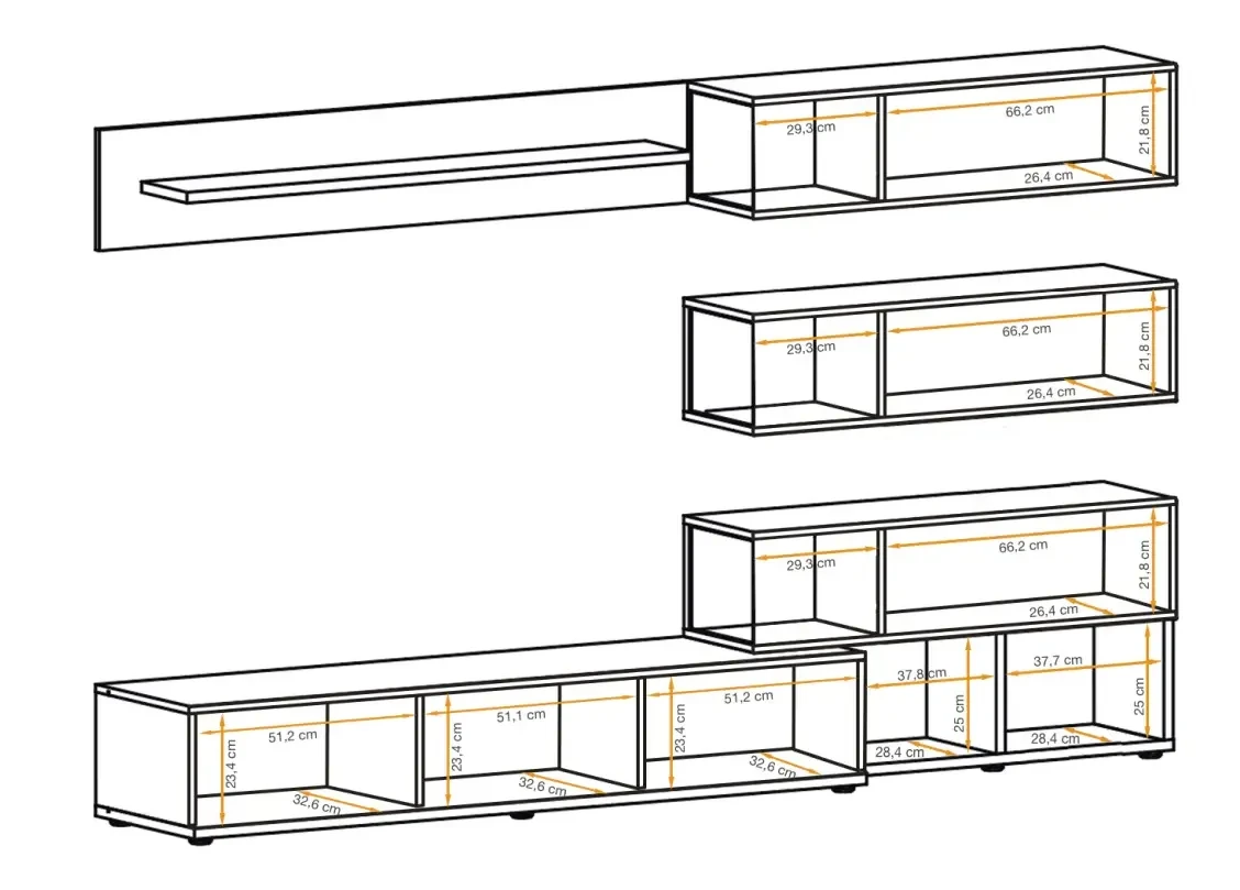 - Witryny wiszące (3 sztuki): 100 cm (szer.) x 25 cm (wys.) x 30 cm (gł.)