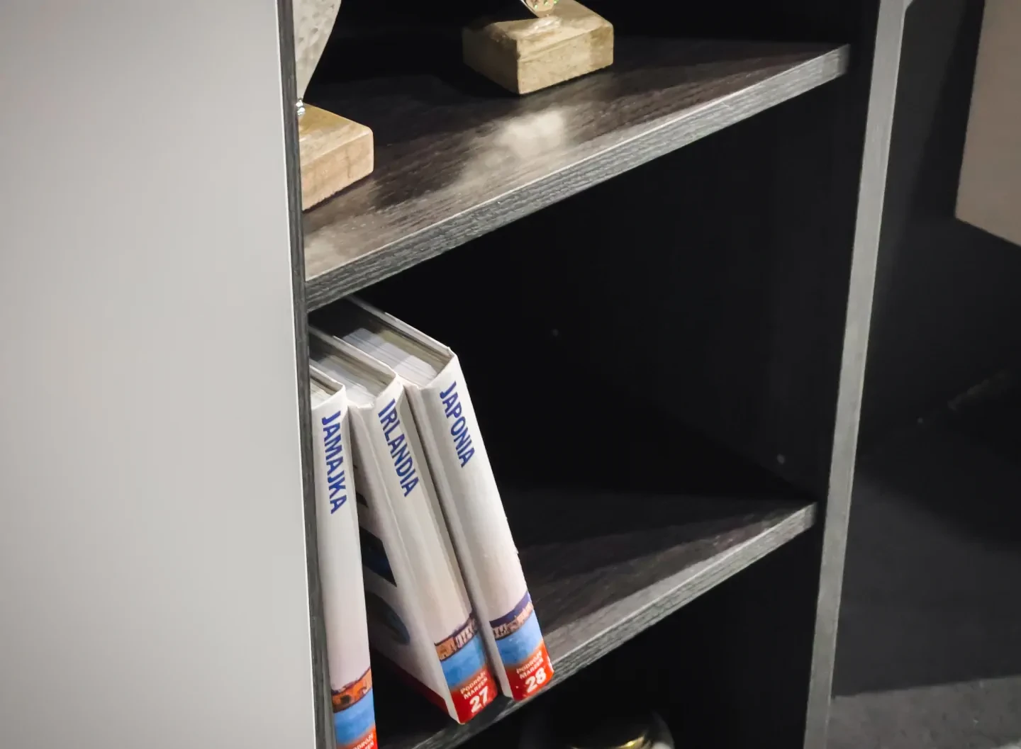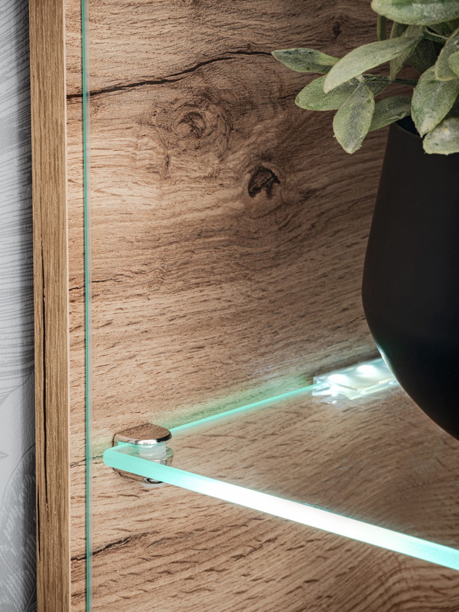 - Wbudowane oświetlenie LED – białe światło LED subtelnie podkreśla elegancję przeszklonych półek, tworząc przyjemną atmosferę, szczególnie wieczorami. To rozwiązanie nadaje wnętrzu wyjątkowego klimatu, a jednocześnie eksponuje elementy dekoracyjne umieszczone na półkach.