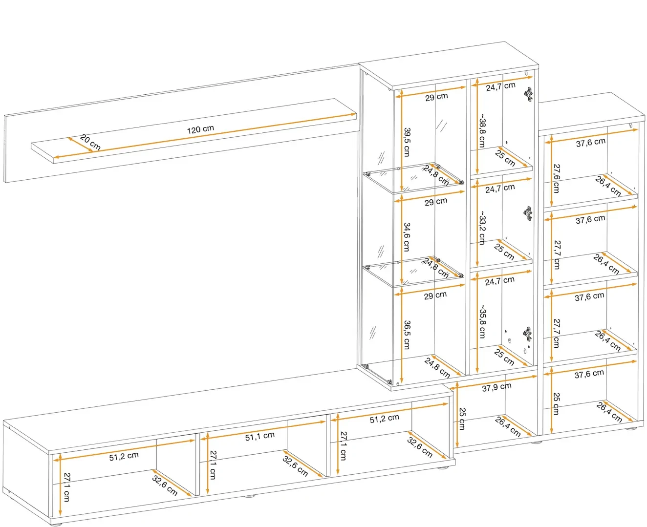 - Funkcjonalność i przestronność – meblościanka Silk II oferuje różnorodne przestrzenie do przechowywania, w tym szafkę RTV z trzema komorami, szafkę z drzwiami częściowo przeszklonymi oraz półki otwarte, które umożliwiają wygodne i estetyczne uporządkowanie książek, dekoracji, czy sprzętu RTV. To idealny wybór dla osób, które cenią porządek i organizację w salonie.