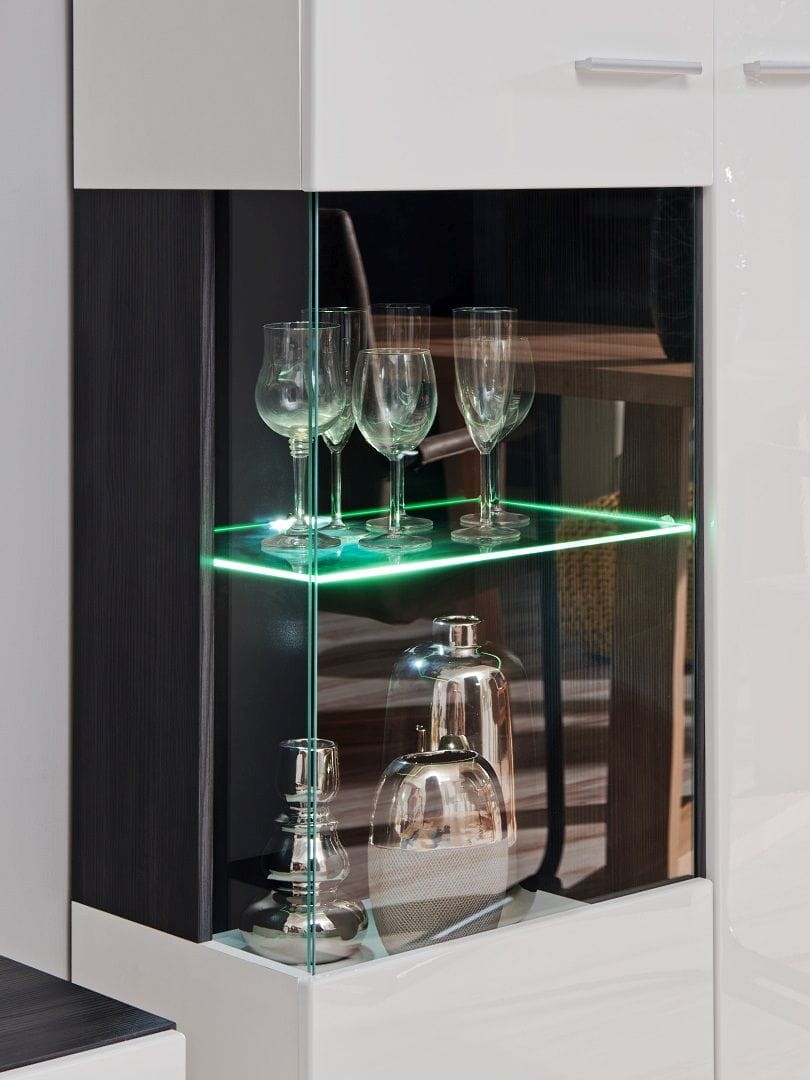 Meblościanka SOLIDO dzięki zastosowaniu prostych brył i nowoczesnego designu łączącego białe fronty w połysku z białym korpusem ze wstawkami z czarnej sosny norweskiej pozwoli spełnić oczekiwania wszystkich, którzy preferują nowoczesny wygląd wnętrz. System został wykonany z płyty laminowanej oraz płyty MDF, które zapewniają wysoką odporność na zarysowania oraz promienie słoneczne, dzięki temu zachowają swój atrakcyjny wygląd przez długi czas. Przeszklone witryny z hartowanego szkła dzięki dodatkowemu podświetleniu pozwolą wyeksponować przedmioty w nich umieszczone. Meblościanka SOLIDO doskonale wpasuje się do nowoczesnego salonu, podkreślając niepowtarzalny i unikatowy styl pomieszczenia.