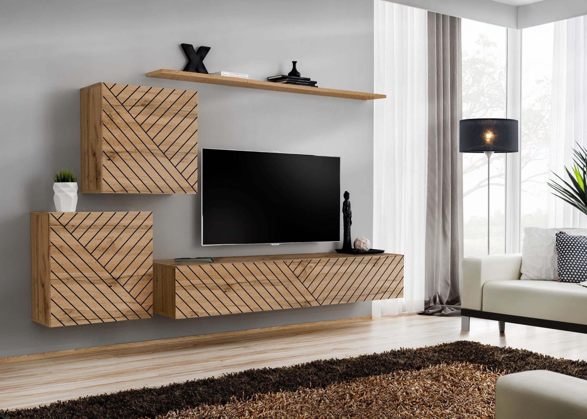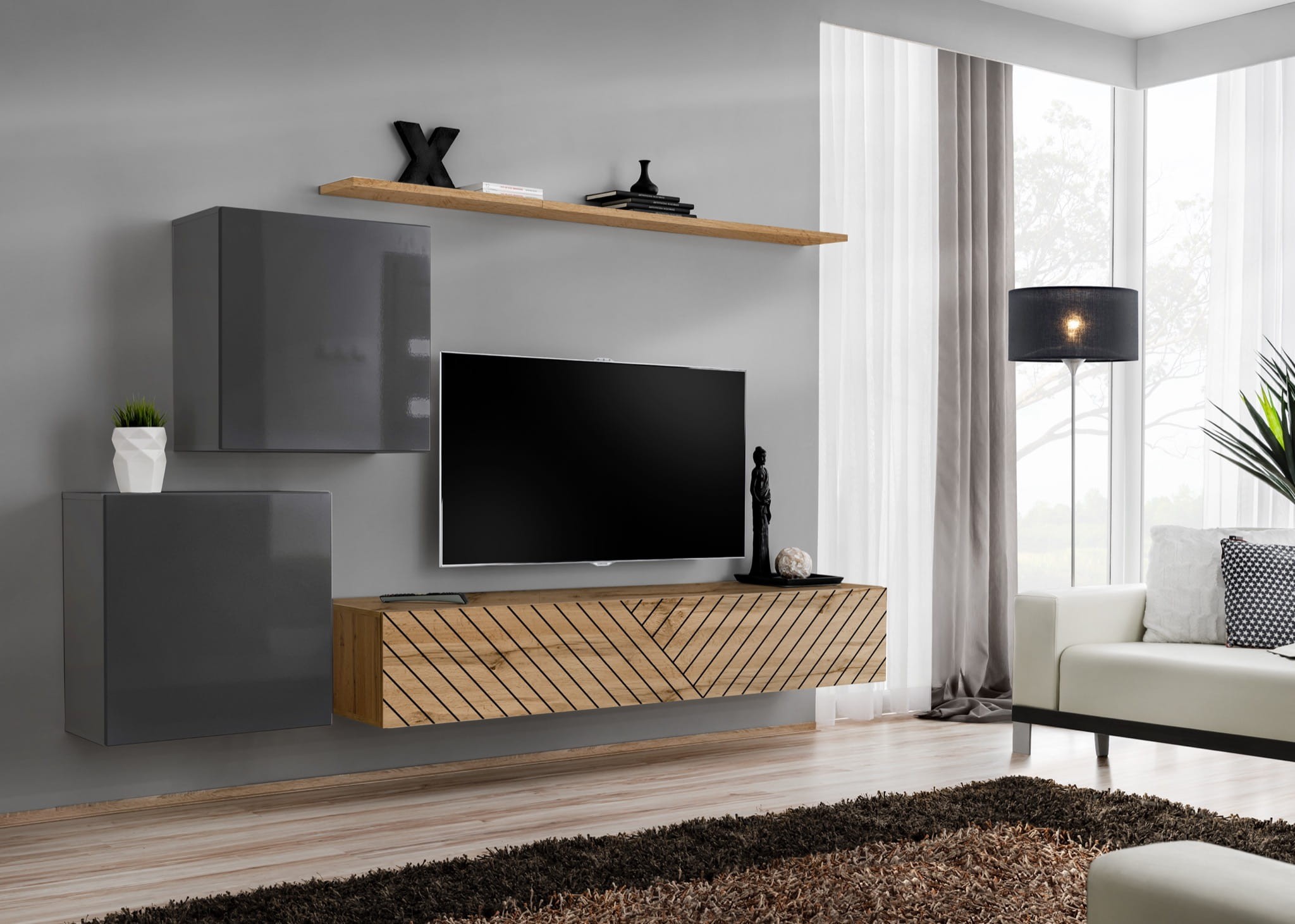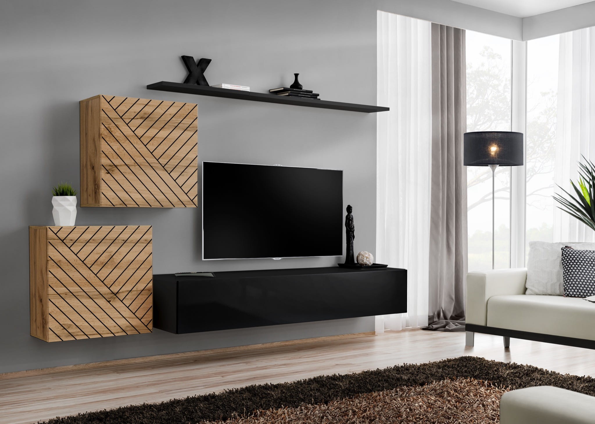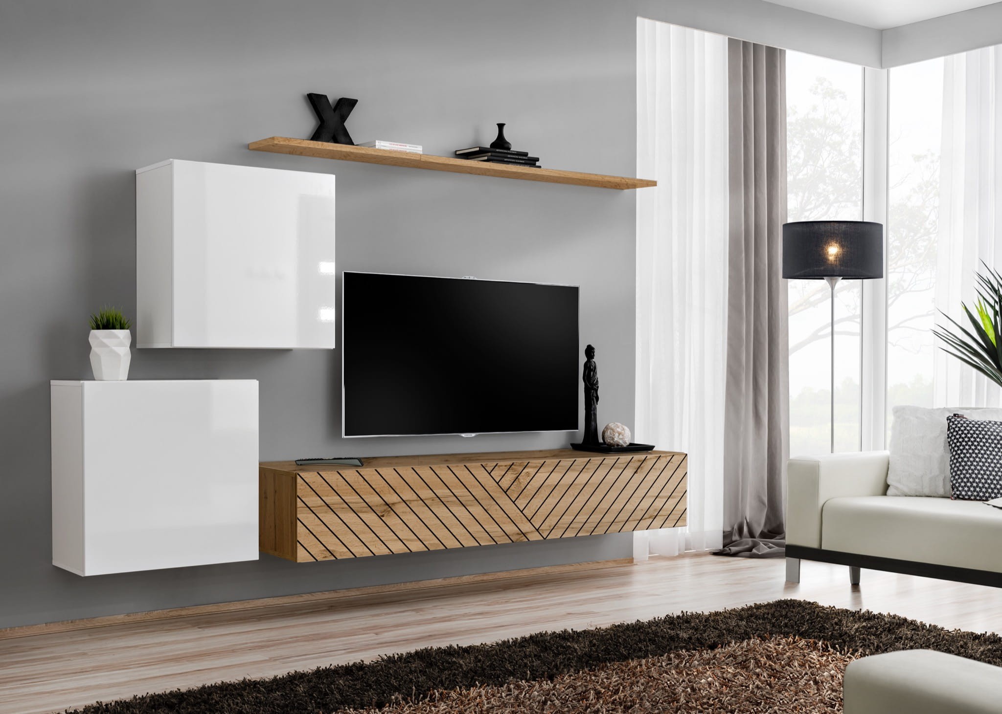 Szafki kwadratowe: biały / biały wysoki połysk PVC | Szafka RTV: wotan / wotan PVC | Półka: wotan - Wotan/Czarny