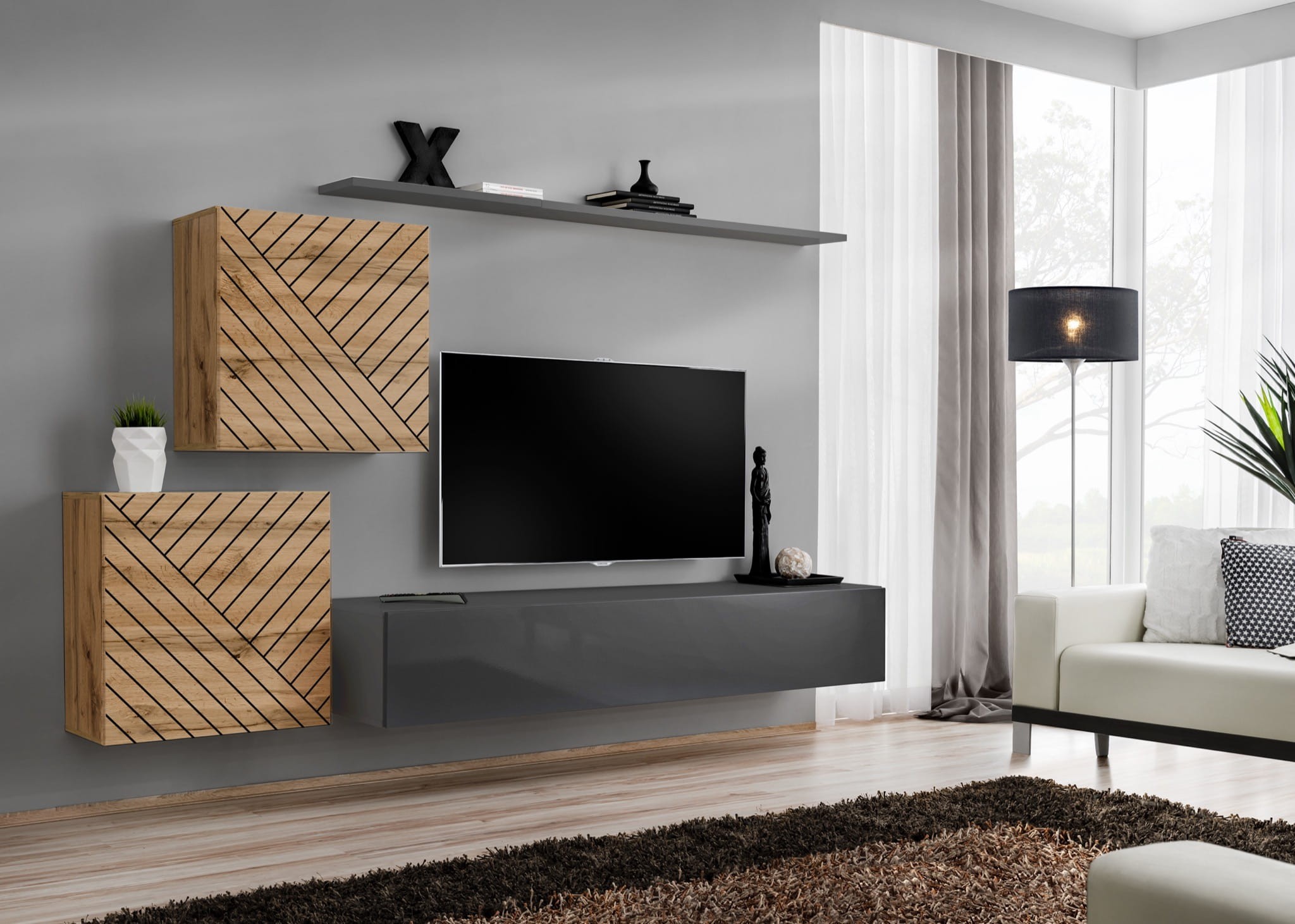 Szafki kwadratowe: grafit / grafit wysoki połysk PVC | Szafka RTV: wotan / wotan PVC | Półka: wotan