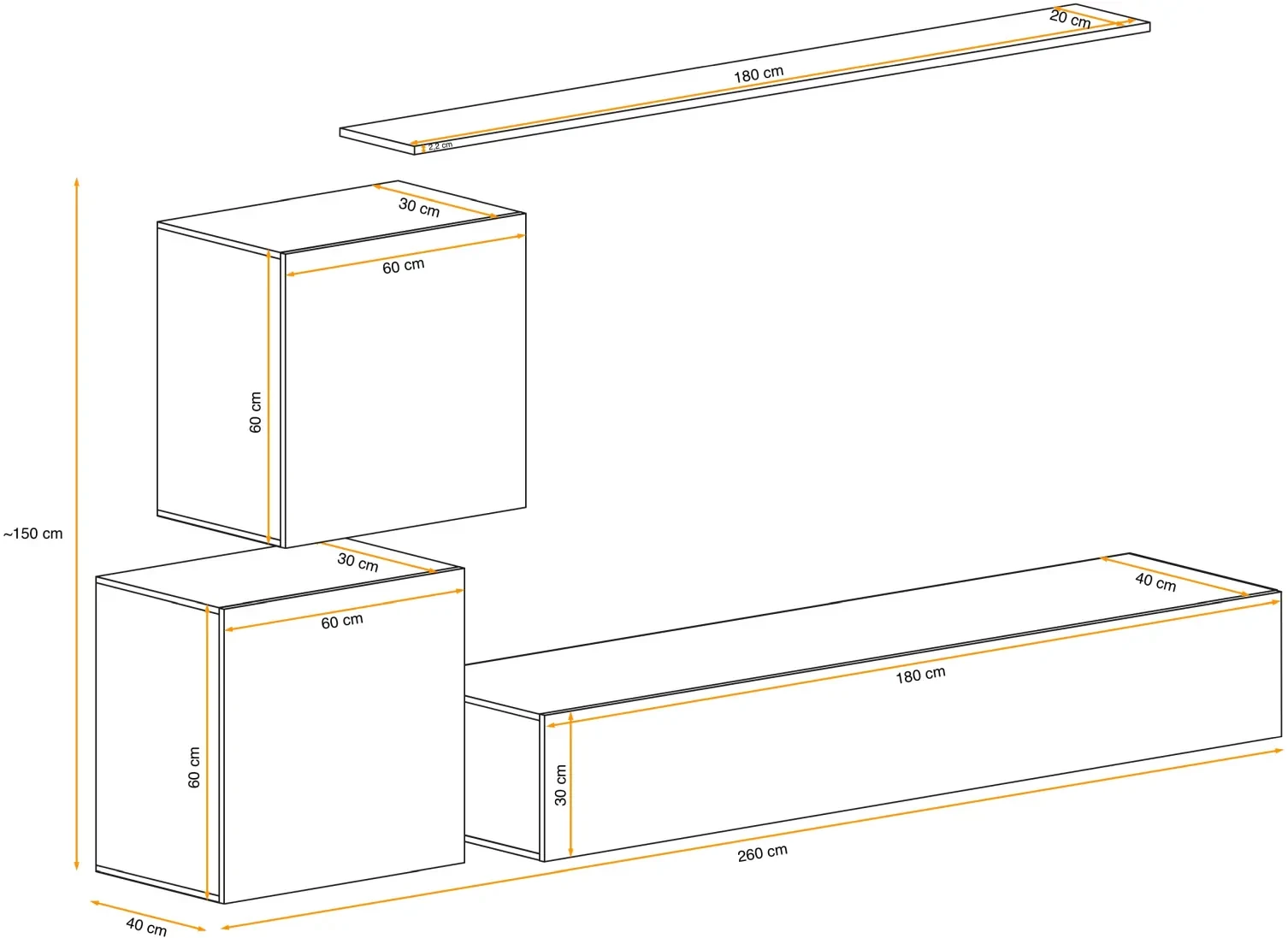 - Całość: ~250 cm (szer.) x ~150 cm (wys.) x 40 cm (gł.)