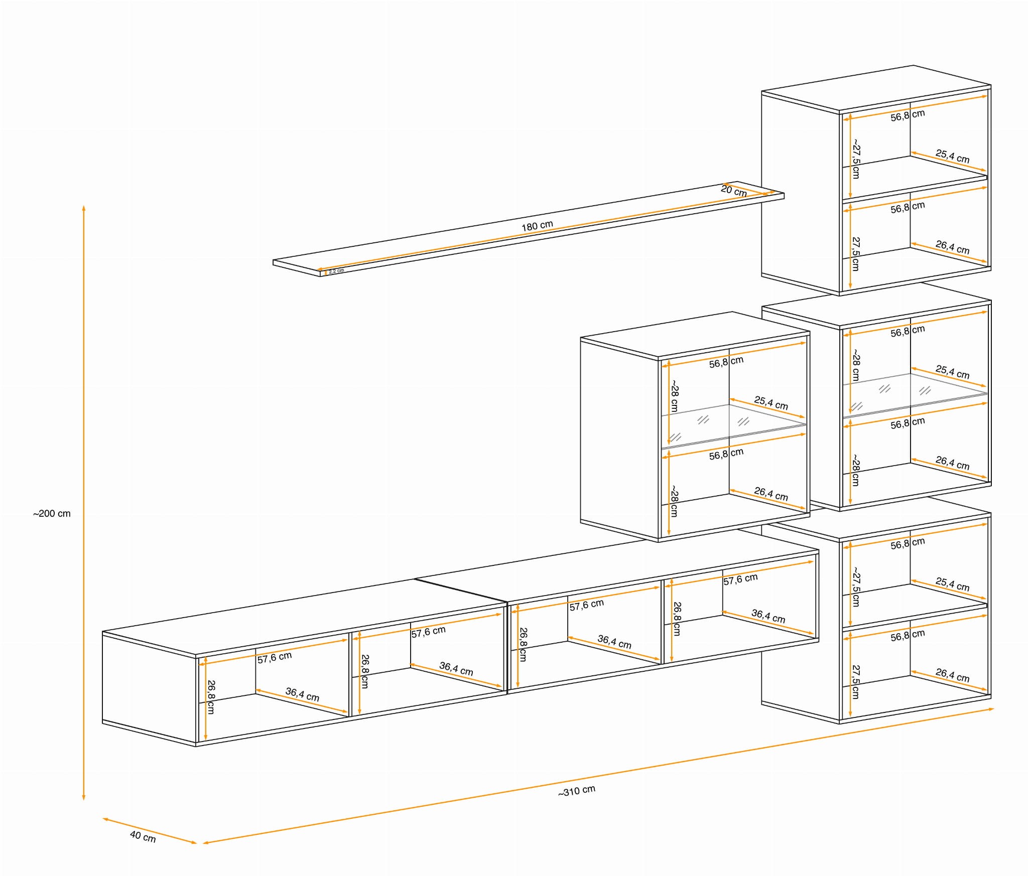 - Całość: ~310 cm (szerokość) x ~200 cm (wysokość) x 40 cm (głębokość)
