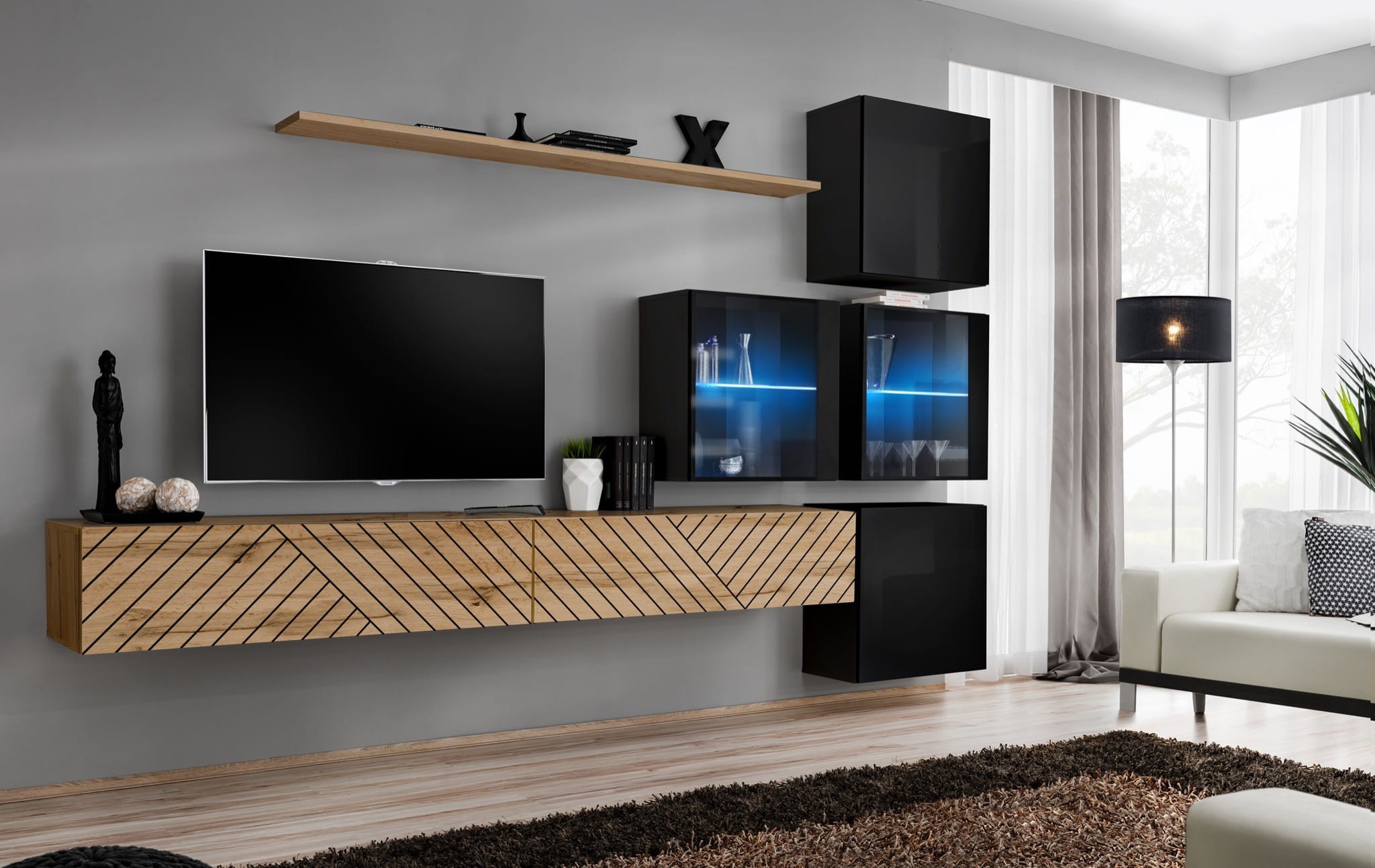 Szafki RTV: wotan / wotan PVC | Witryny + Szafki kwadratowe: czarny / czarny wysoki połysk PVC | Półki: wotan - Wotan/Grafit