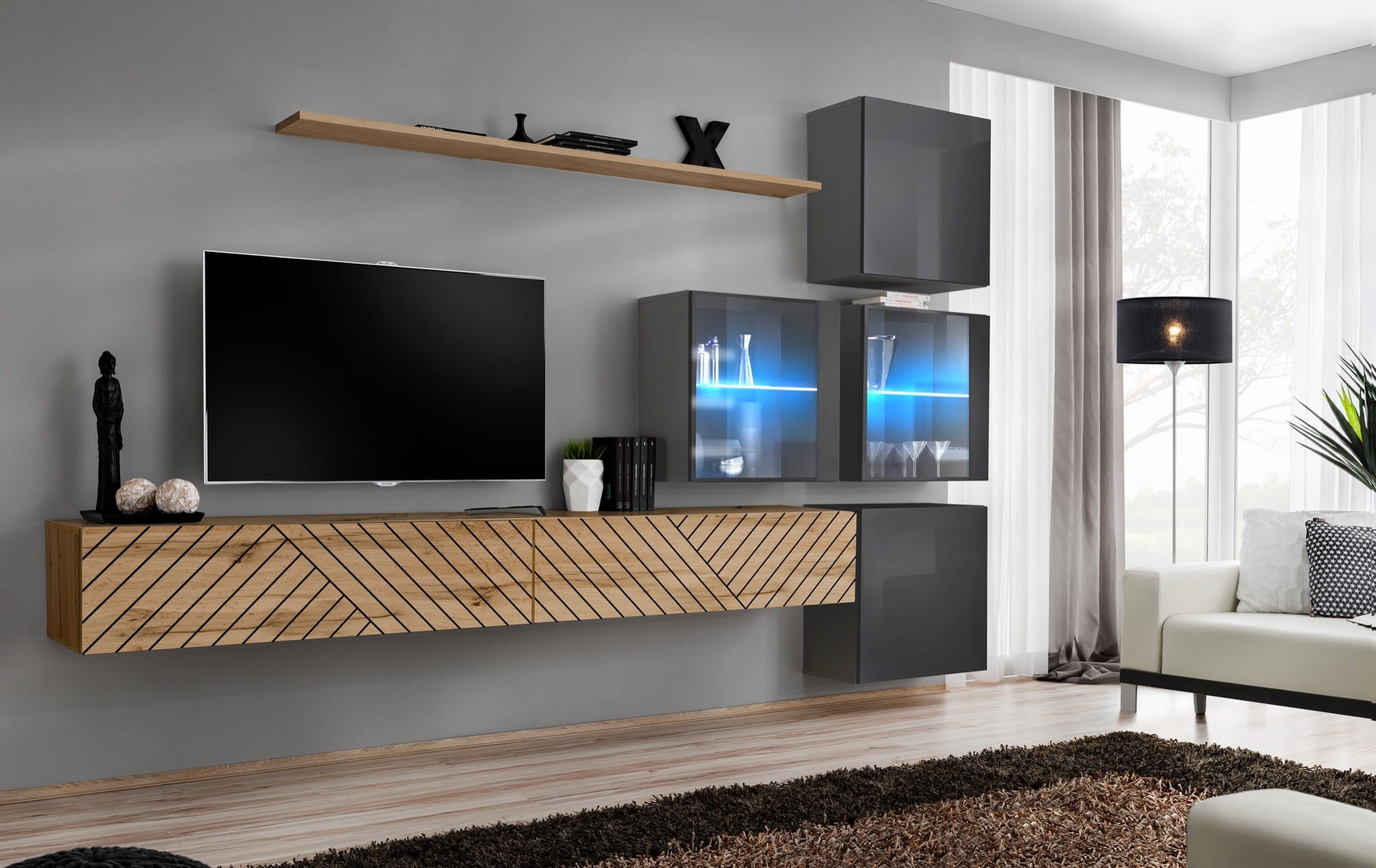 Szafki RTV: wotan / wotan PVC | Witryny + Szafki kwadratowe: grafit / grafit wysoki połysk PVC | Półki: wotan