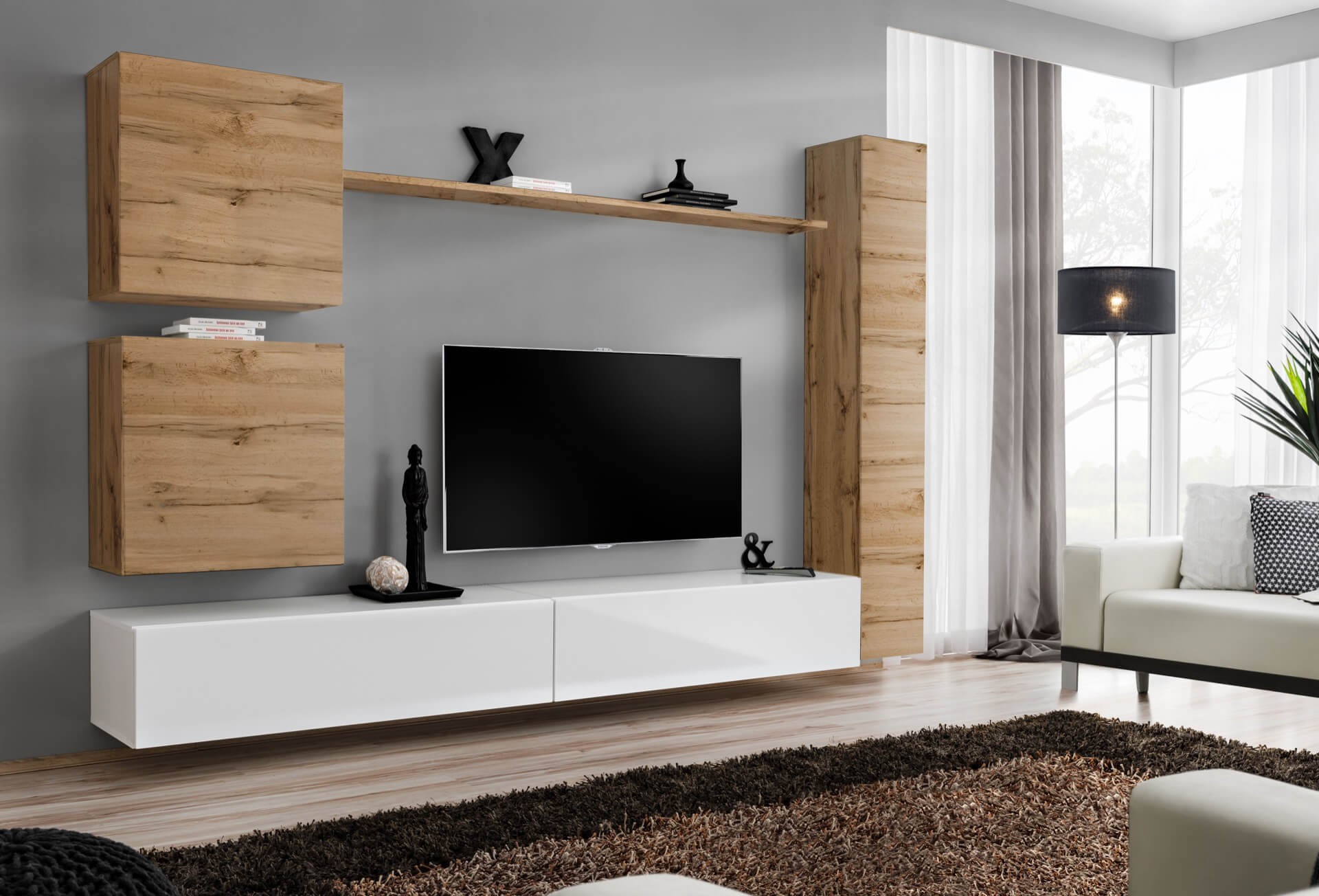 Meblościanka Switch VIII to nowoczesny zestaw mebli, który łączy w sobie funkcjonalność i styl. Składa się z witryn wiszących z pełnymi drzwiami, za którymi kryją się praktyczne półki, umożliwiające efektywne zorganizowanie przestrzeni. W skład zestawu wchodzą również dwie szafki RTV, które mogą pomieścić różnorodny sprzęt elektroniczny oraz jedna półka wisząca, dodająca miejsca na dekoracje lub książki. Elementy mebloscianki wyposażone są w system otwierania push-click, co zapewnia łatwy dostęp do przechowywanych przedmiotów bez widocznych uchwytów, zachowując jednocześnie minimalistyczny wygląd. Uniwersalny montaż drzwi pozwala na dostosowanie mebli do indywidualnych potrzeb i preferencji użytkownika, co czyni ten zestaw wyjątkowo funkcjonalnym i atrakcyjnym rozwiązaniem do każdego nowoczesnego wnętrza. Meblościanka Switch VIII dostępna jest w 16 wariantach kolorystycznych.